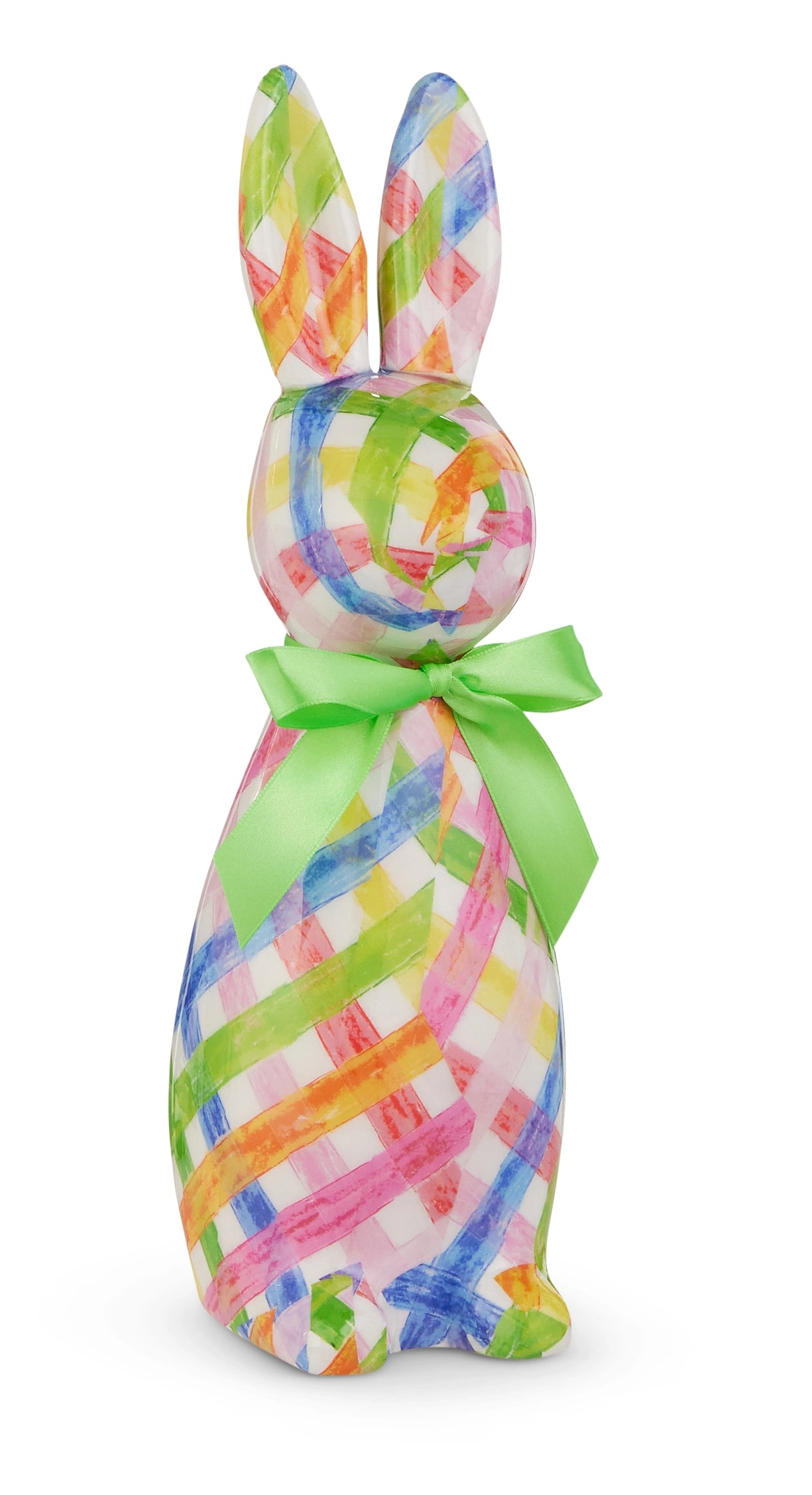 This 12" sweet bunny features a charming woven pattern in colorful tones, blending artisanal texture with whimsical design. Perfect for shelves, tabletops or stand alone.