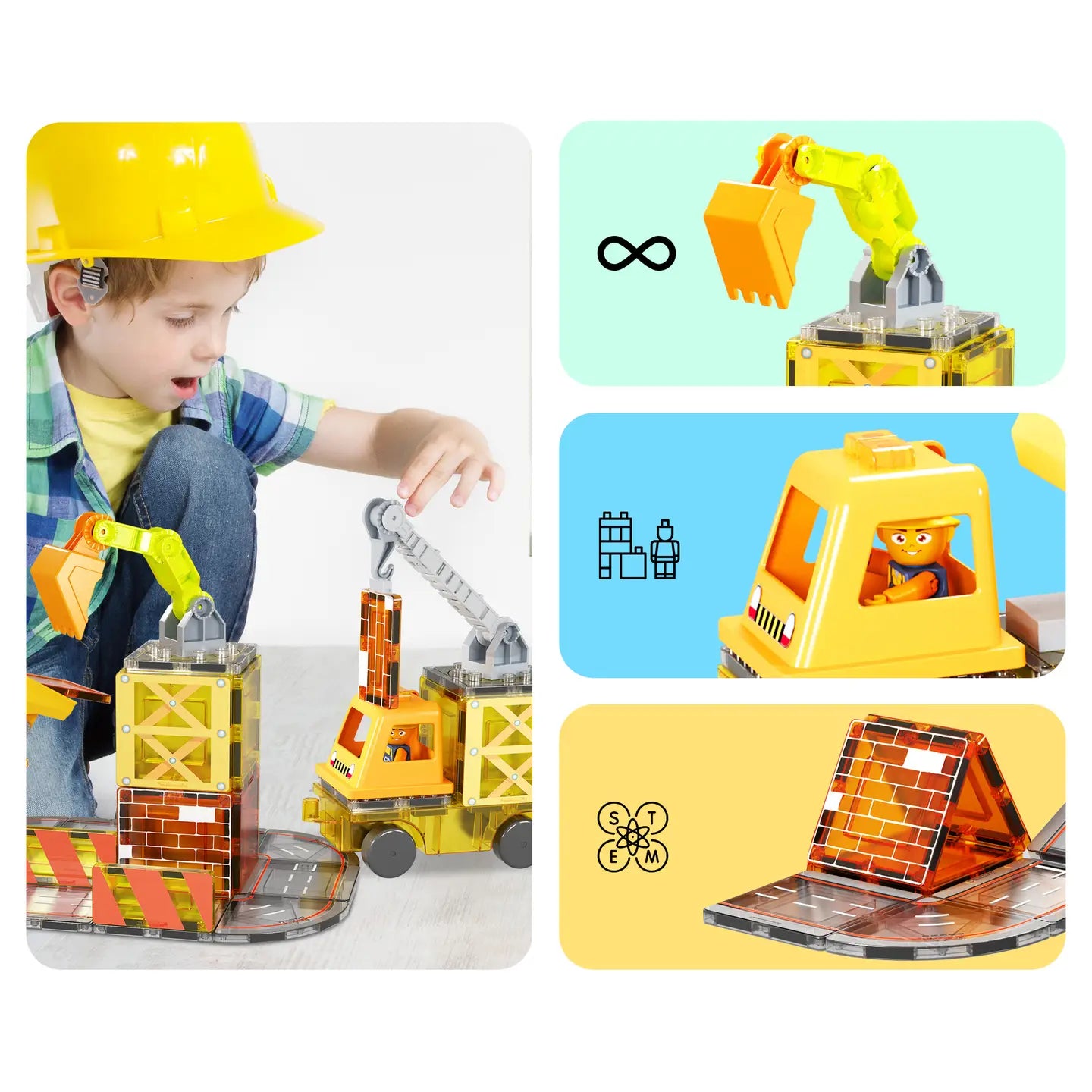 This 50-piece 5-in-1 playset is compatible with other PicassoTiles interlocking building bricks and magnet tiles educational toy set. It features 32 construction themed magnetic tiles, 2 character action figures, 2 car bases, and 14 interchangeable pieces for a crane, dump, ladder, excavator or backhoe truck. The magnetic character action figure has omnidirectional arms and legs, allowing you to rotate them around its body for more versatility, pretend and creative play.