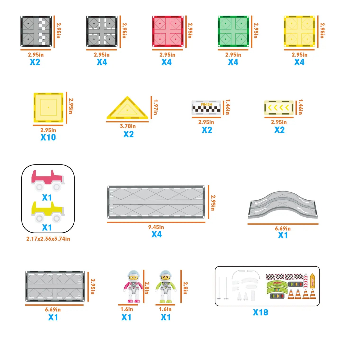 PicassoTiles 62 piece Magnetic Tile Building Blocks Racing Track Playset (PTR05) creates an exciting journey of play and learning. With 62 pieces, including character action figures that can ride in the included vehicles, children will set off on thrilling adventures while developing STEM skills through imaginative pretend play.