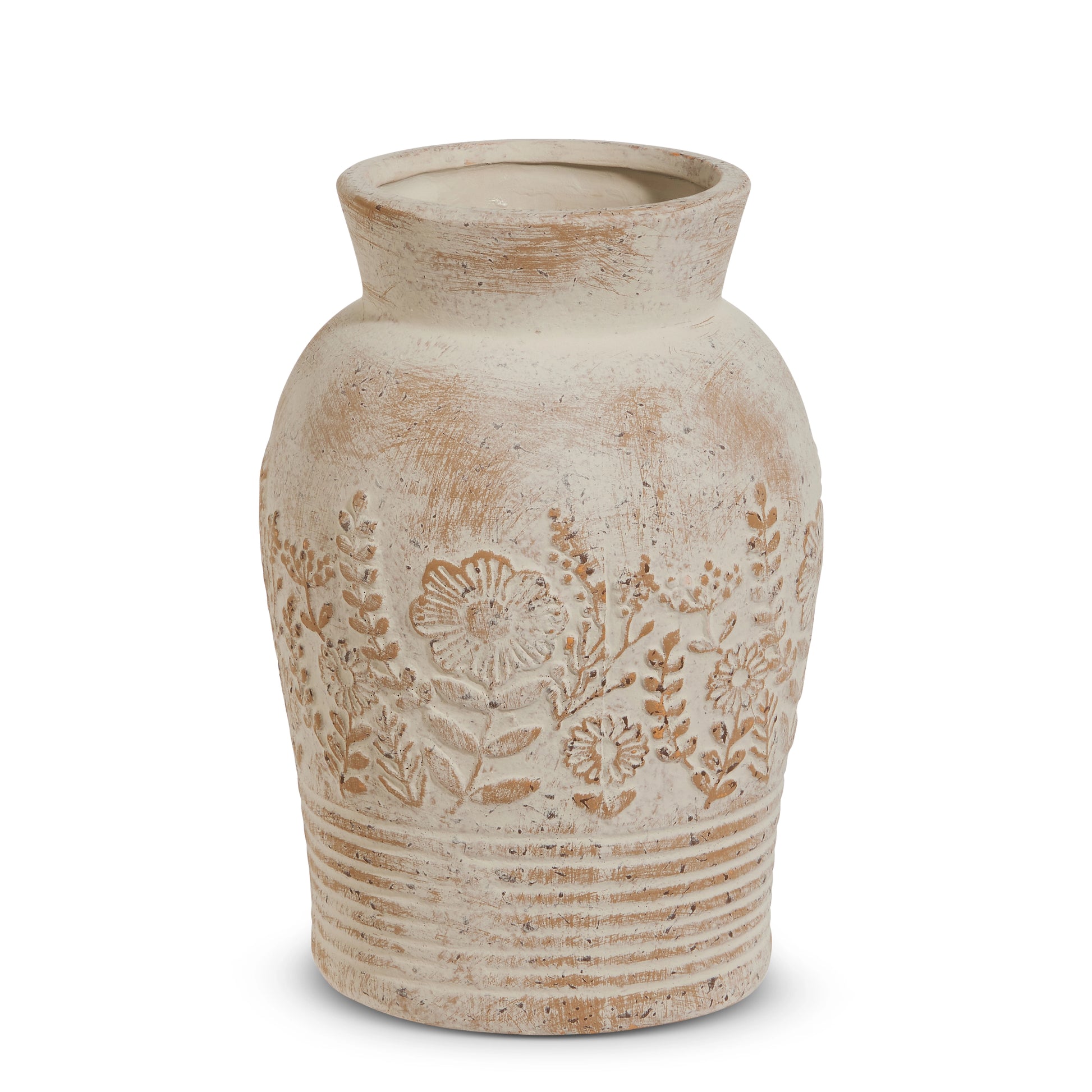 This whitewash vase features a beautifully embossed floral design and a softly distressed finish. creating a timeless piece with a delicate texture and charm.