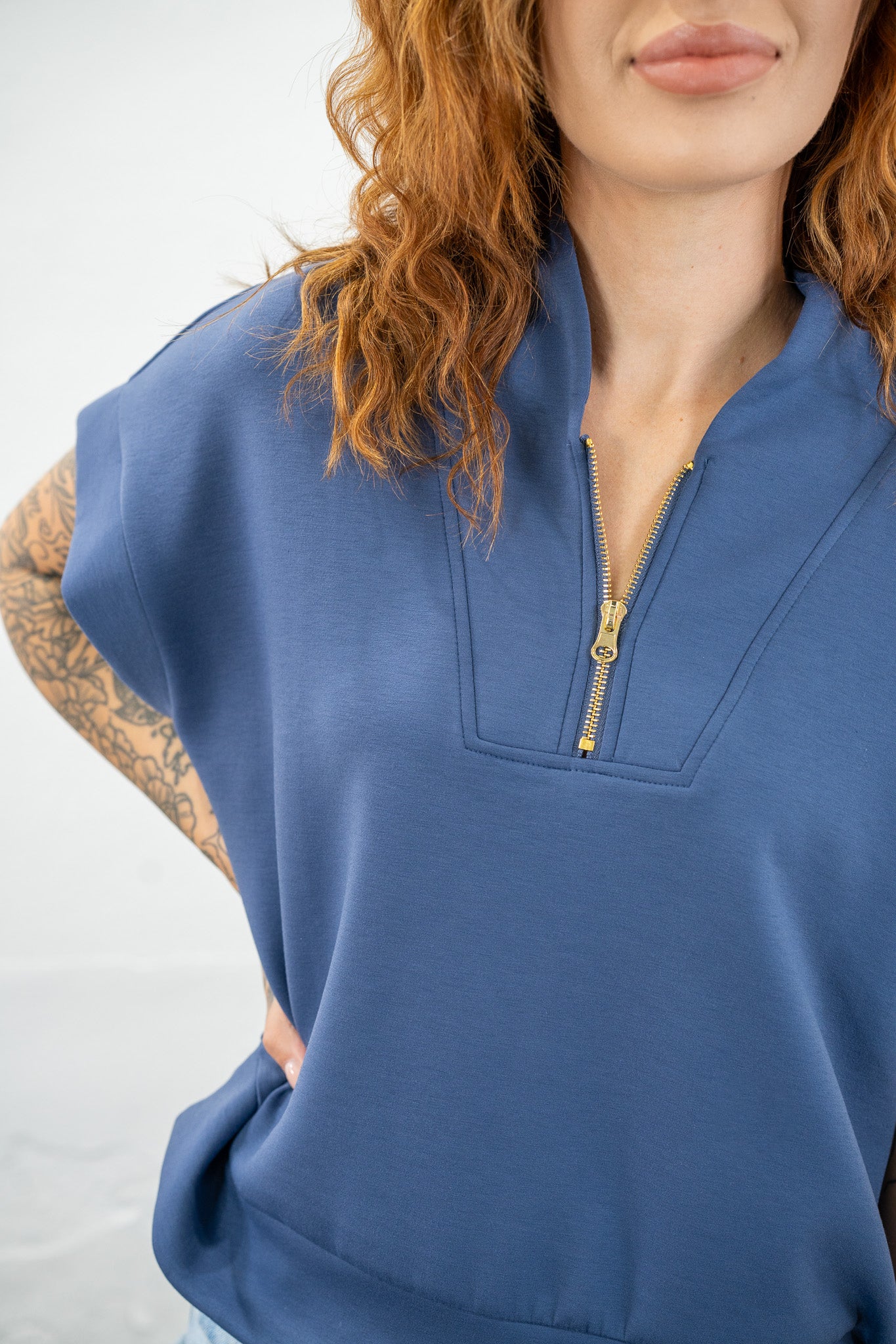 Scuba fabric is back!! This top features a chic zipper at the chest.
