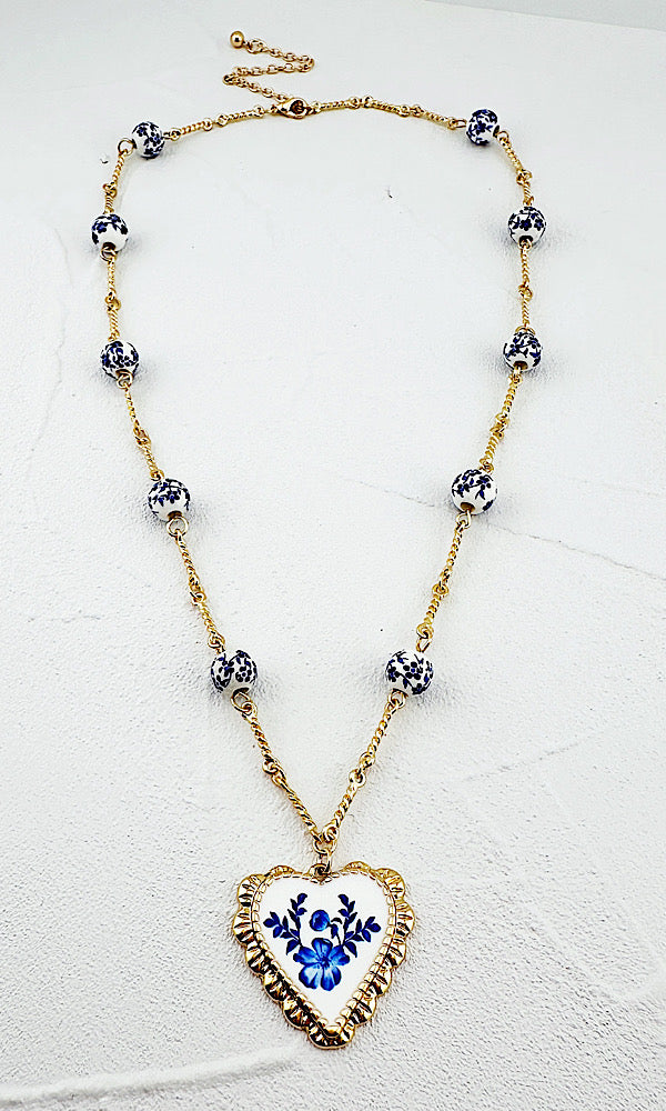 Lightweight & easy to style. Golden chain with ceramic floral station beads. Enamel heart pendant. Adjustable from 18-21". 1" pendant drop.