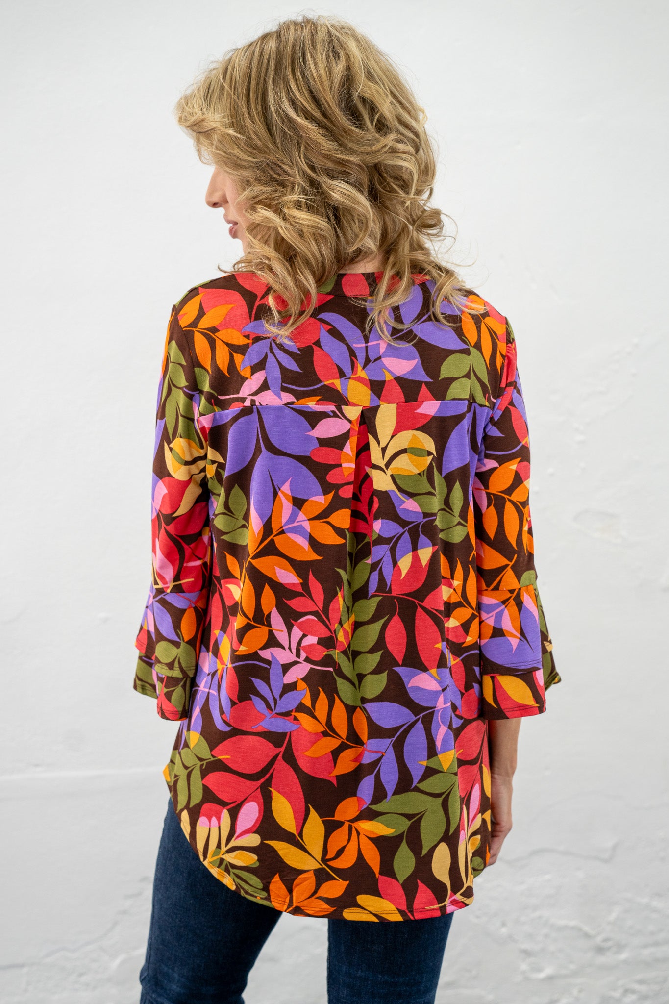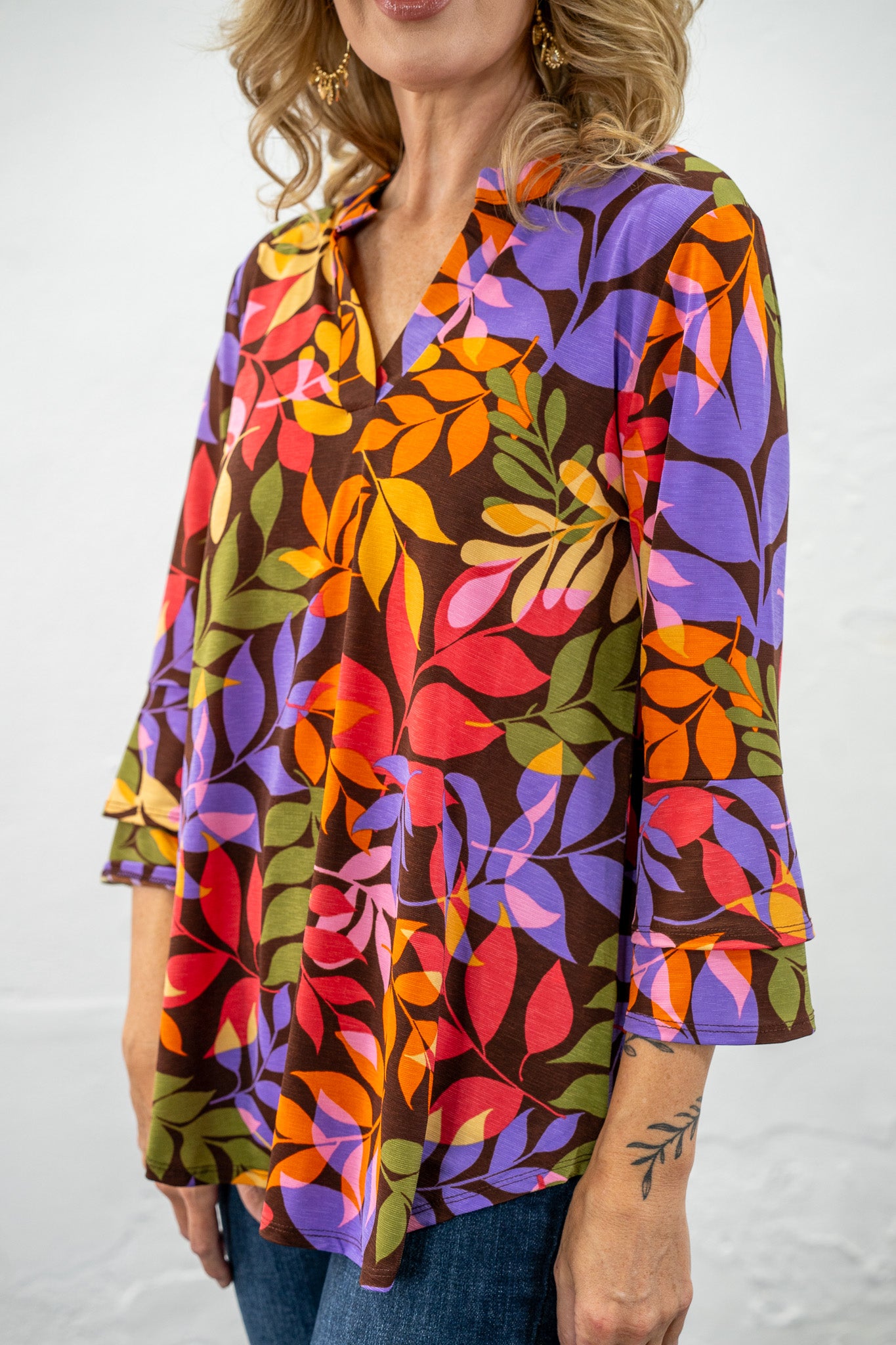V-neckline, stunning greenery prints and dramatic ruffle, bell sleeves take Melissa over the top!