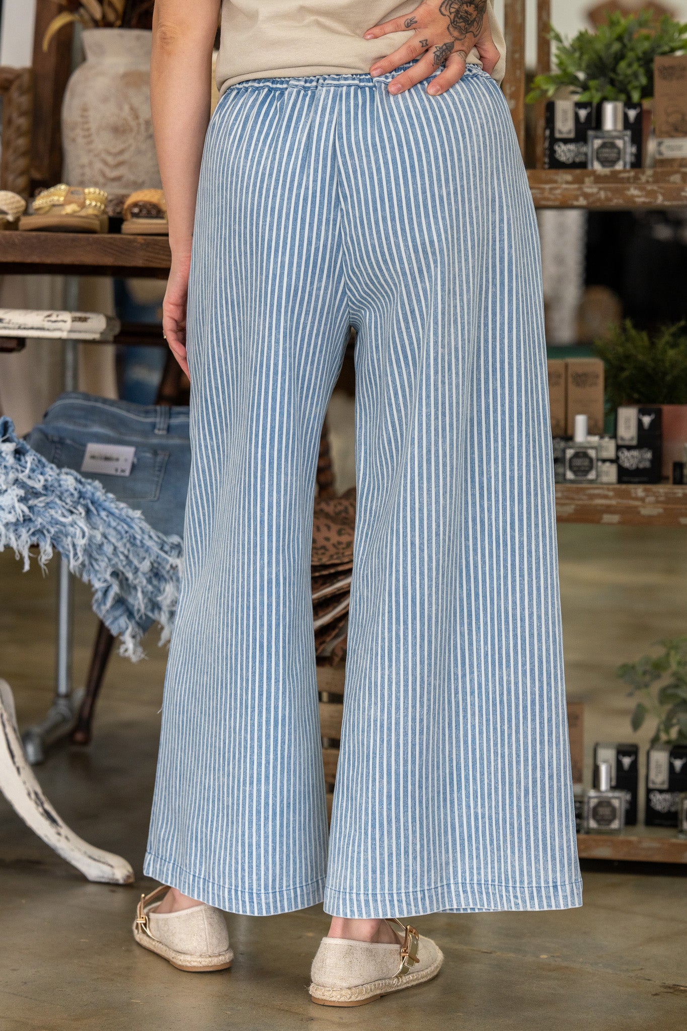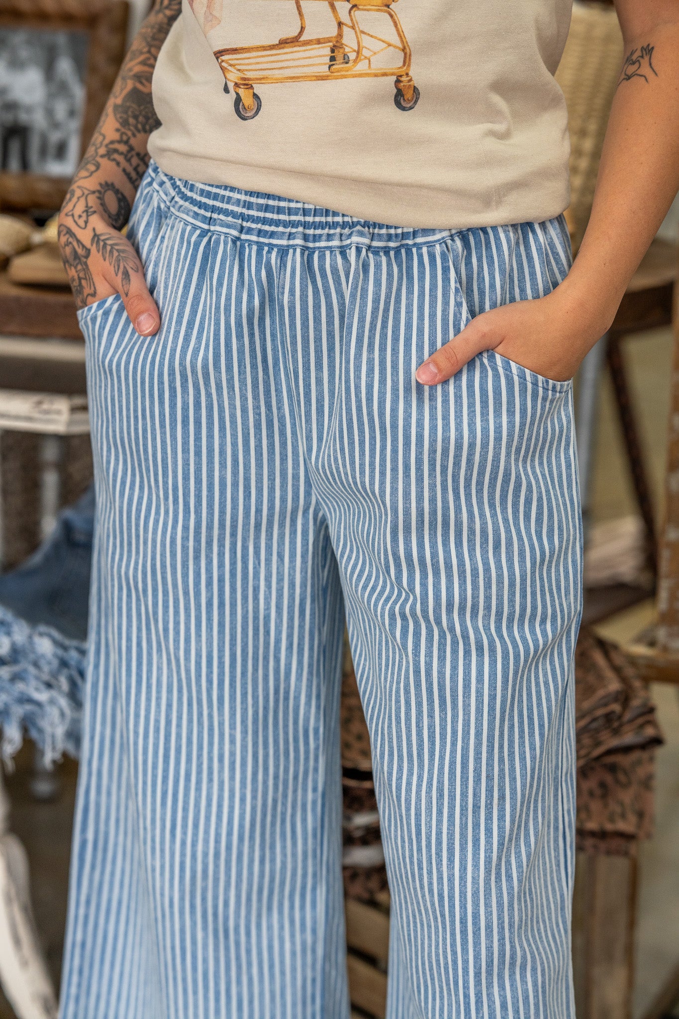 Bring effortless coastal charm to your everyday wardrobe with our Anchors Up Striped Denim Pants....they're so stinkin' cool! Pull-on style with elastic waistband and pockets.
