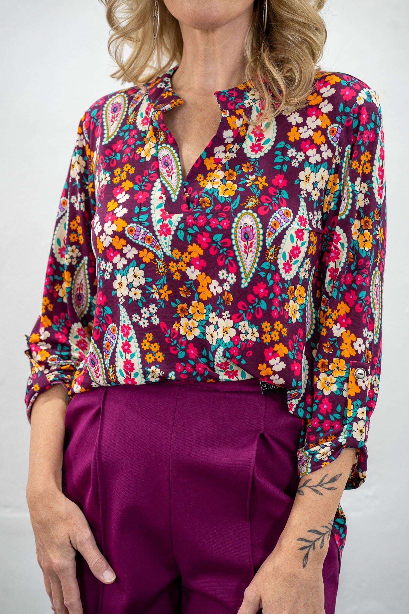 V-neckline, stunning florals and 3/4 sleeves with a gathered button!
