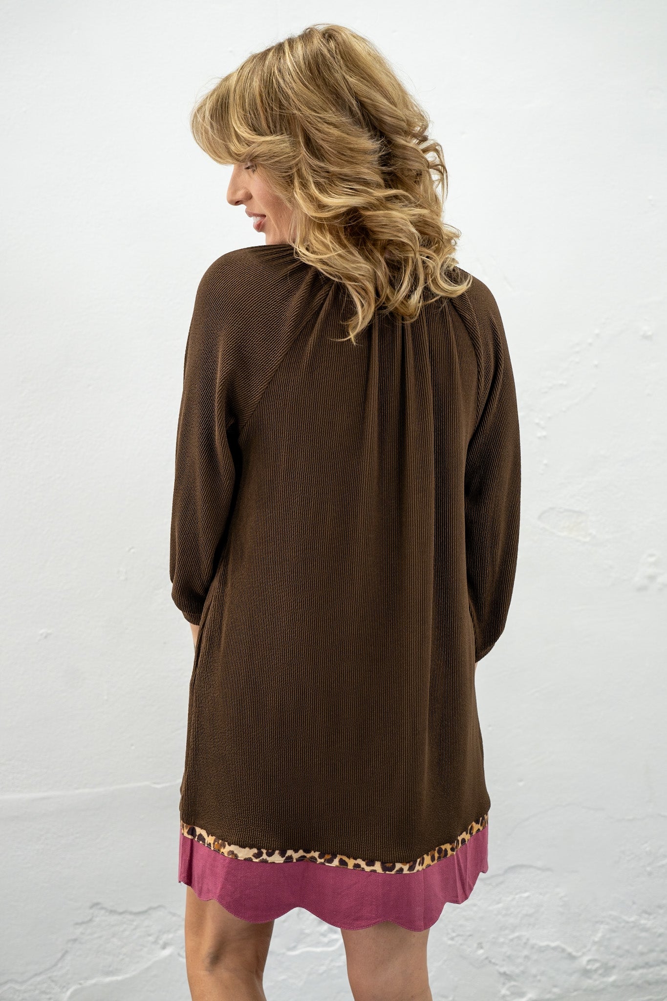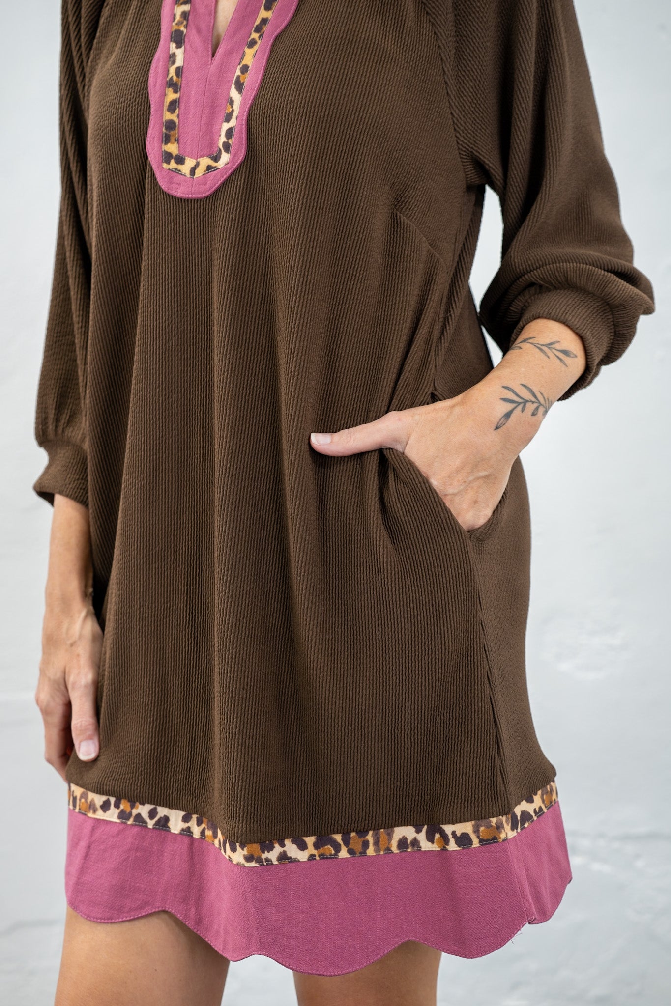 Loose, easy fitting with stretch. She features pockets, a wavy hemline and cheetah accent.