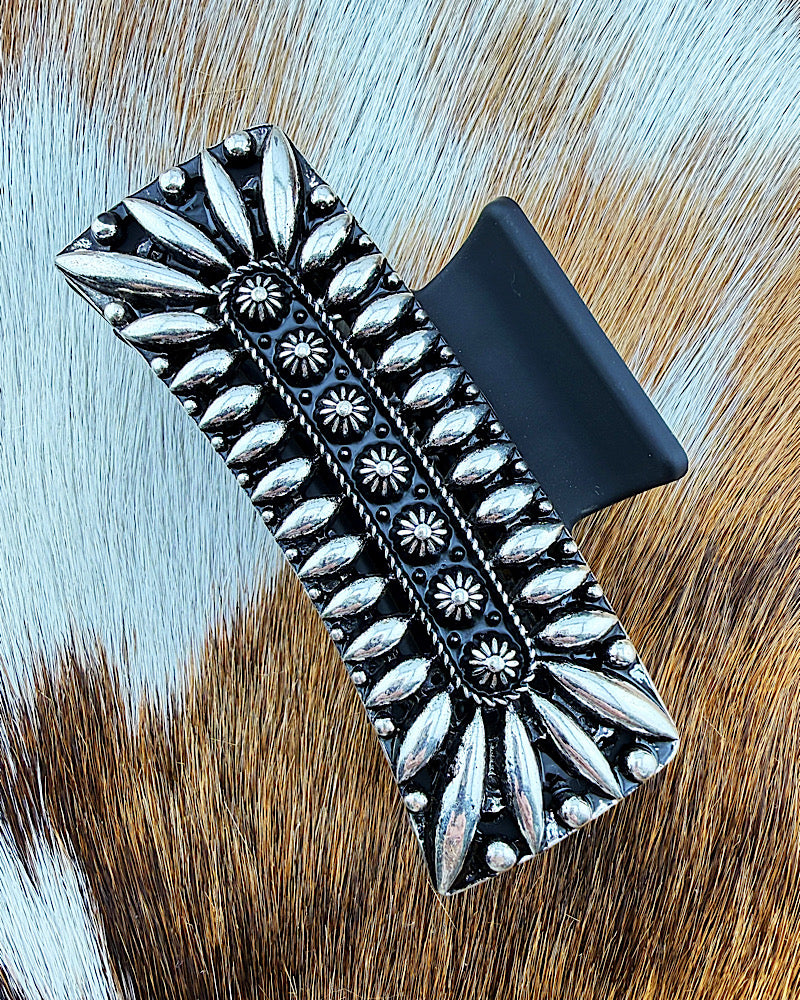 We added a stunning hair clip to our beloved western collection. Matte black acrylic hair clip with metal accents. 3-1/2"