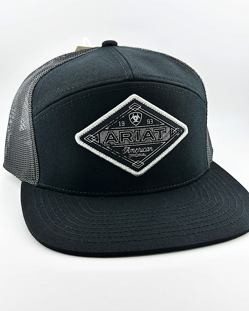 Ariat mens cap. Black front panels and bill. Diamond screen printed patch on front. Black mesh back with a snap back closure for that perfect fit.