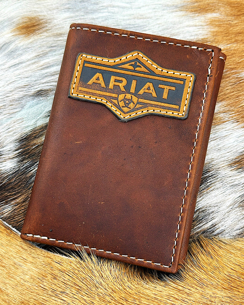 This Ariat rodeo wallet is genuine leather. Heat embossed crazy horse patch with Ariat name and logo. Multiple card slots, cash slot and ID window on the inside.
