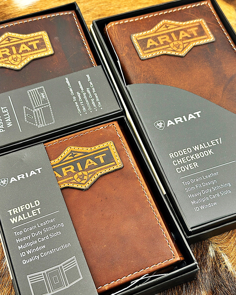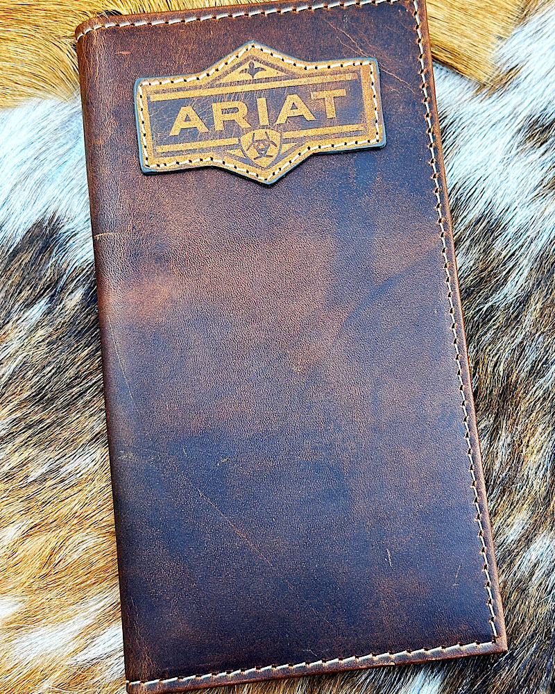 This Ariat rodeo wallet is genuine leather. Heat embossed crazy horse patch with Ariat name and logo. Multiple card and cash slots, checkbook slot and ID window on the inside.