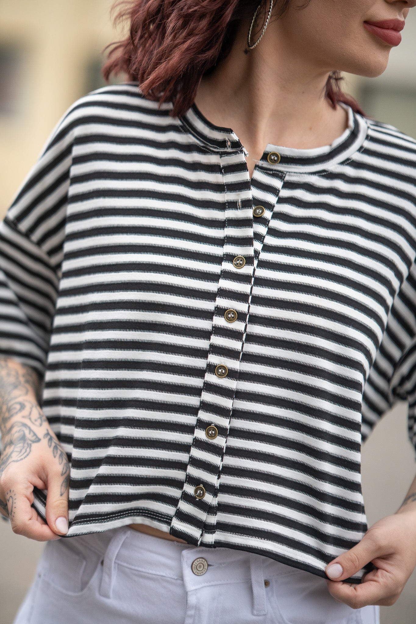 This top is going to make a statement wherever you go. Button down design with a boxy crop style, and trendy stripes!
