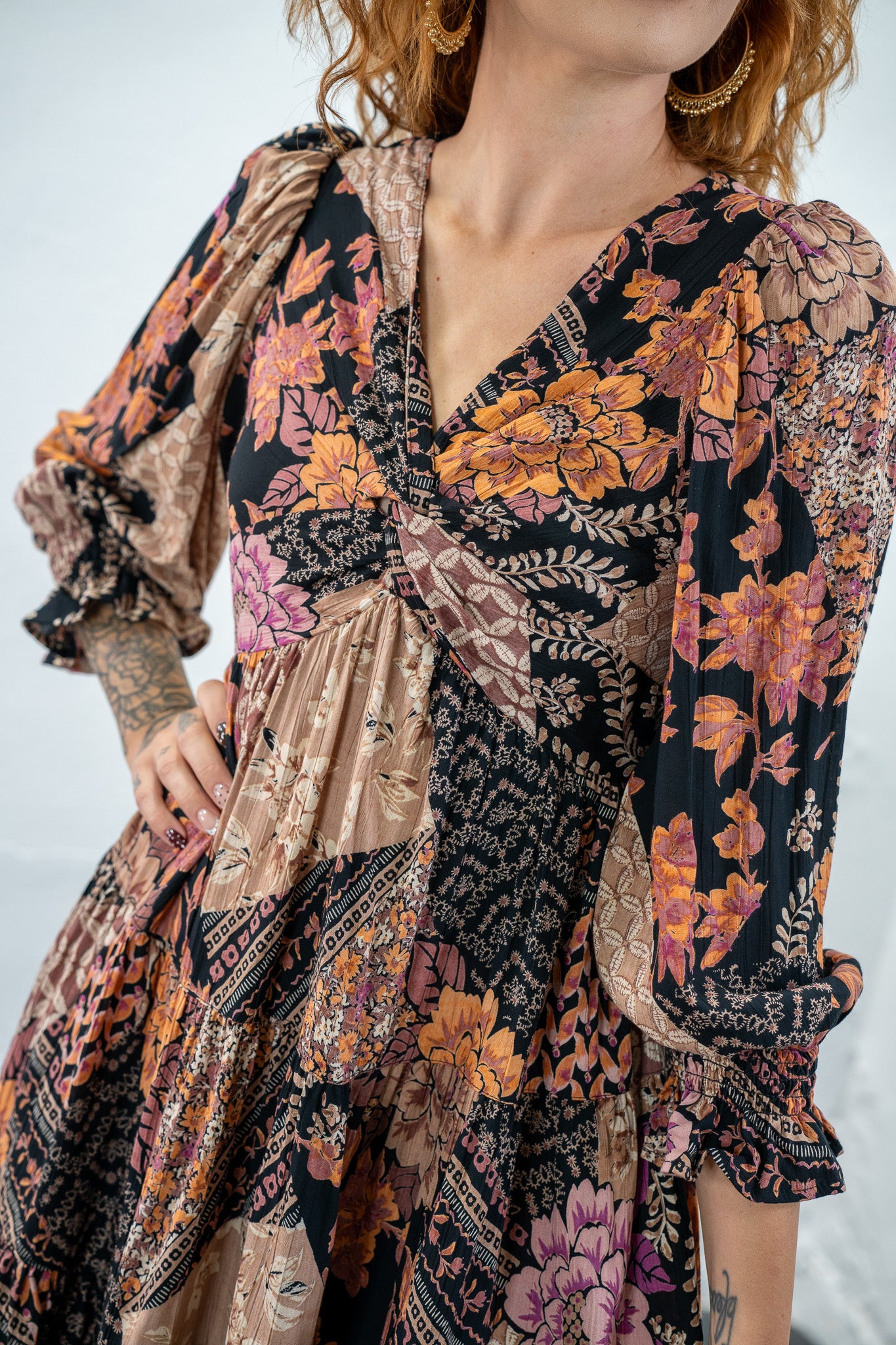 Loose, flowy fit with with stretch at the bust! She features a v-neckline with a twist and 3/4 sleeves!