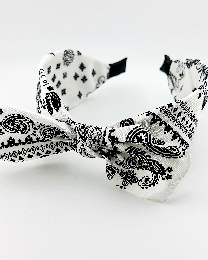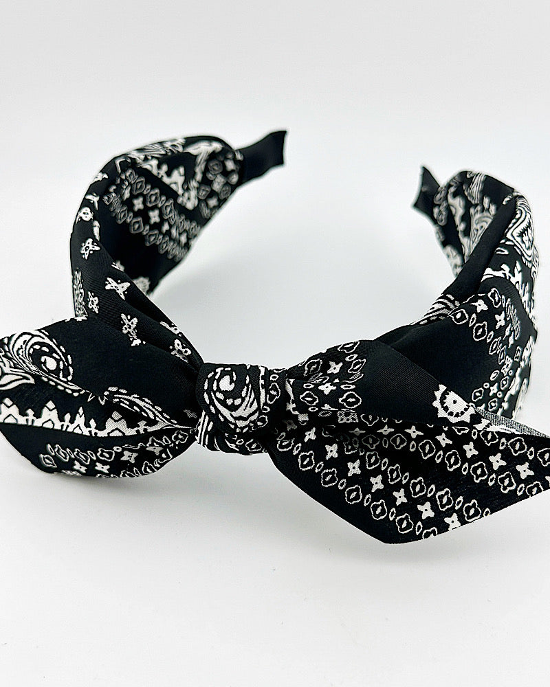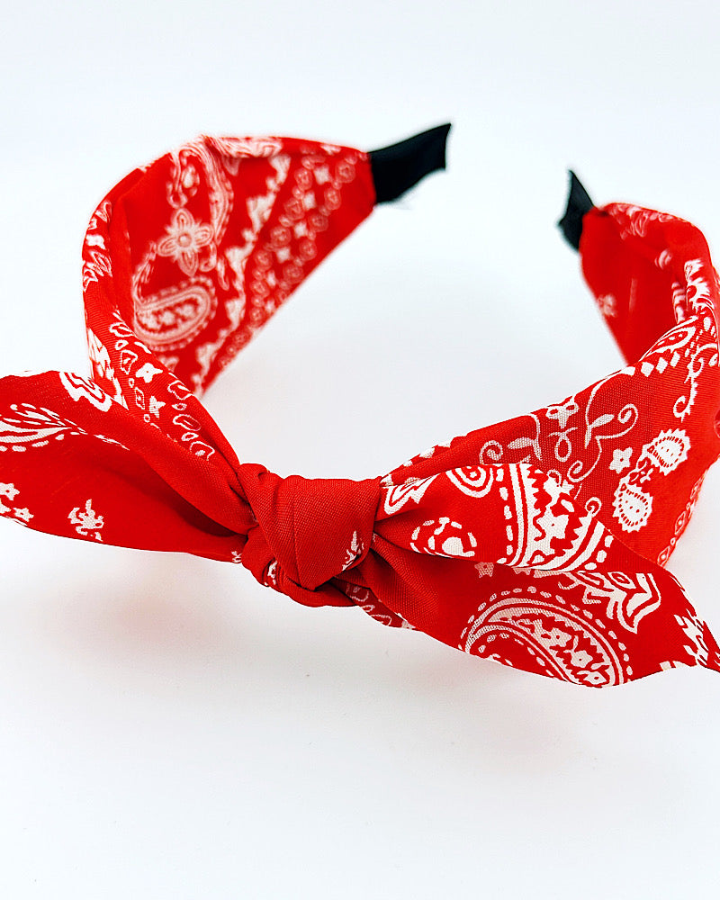 Scarf accessories are trending & our bandana headbands are no exception. Lightweight paisley print knotted headband perfect for girls & ladies. Available in black, white & red. 2-" wide