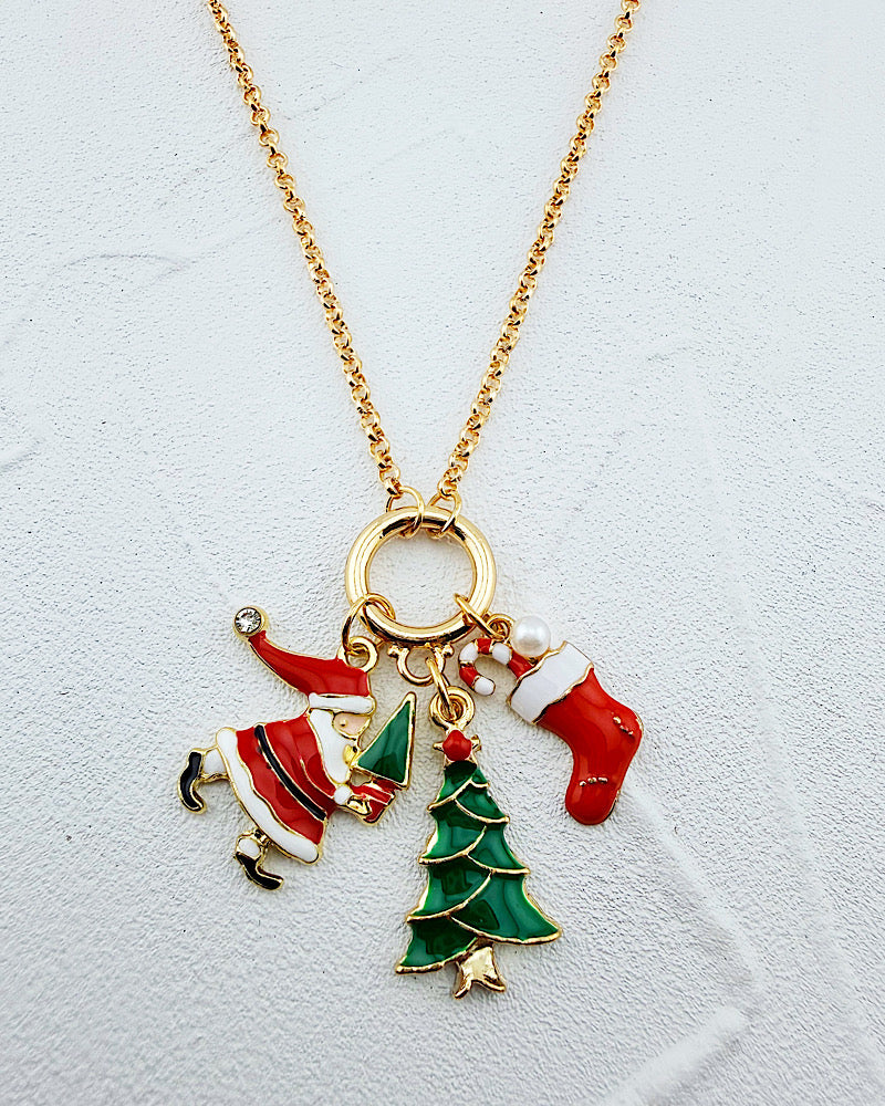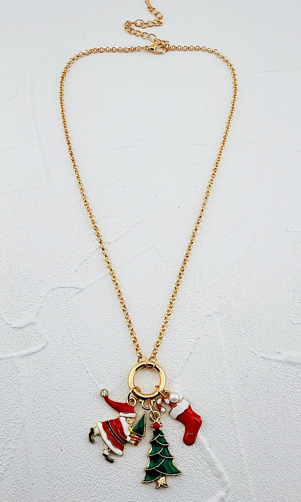 Celebrate the season with this charming multi-pendant necklace featuring festive enamel designs of Santa, a Christmas tree, and a stocking - each accented with sparkling crystals. Adjustable from 17-20"