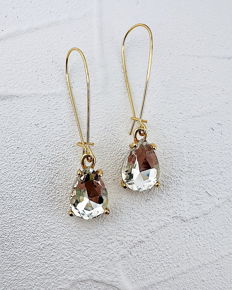 A daintier size in our favorite teardrops. These are the perfect little classy jeweled teardrops. Golden kidney wire, lightweight, 1-7/8" drop.