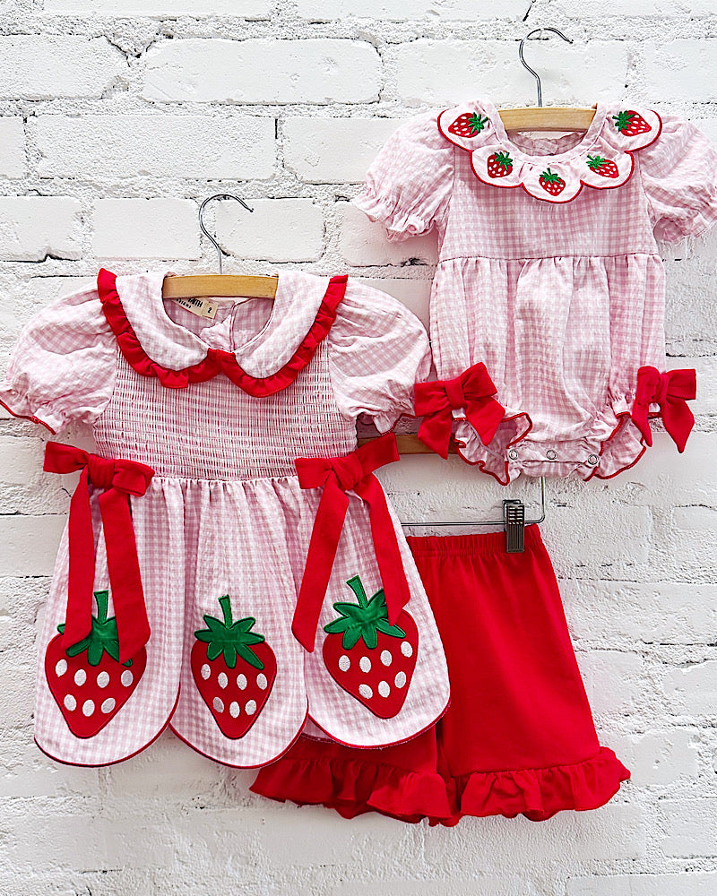 Adorable two-piece set featuring classic plaid styling with charming, smocked detailing and playful strawberry appliques.