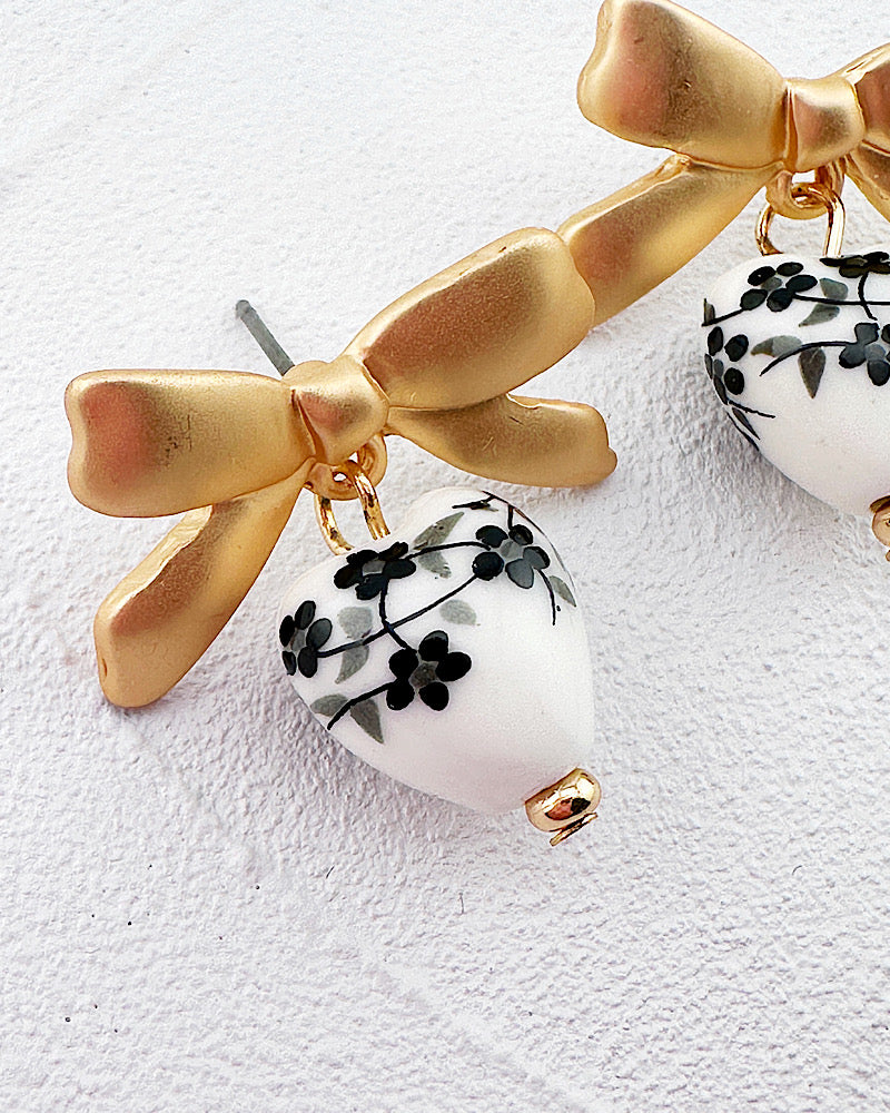 The sweetest addition to our coquette jewelry collection. Betsy is so sweet, featuring a matte gold bow post & black & white ceramic heart dangle. 1"