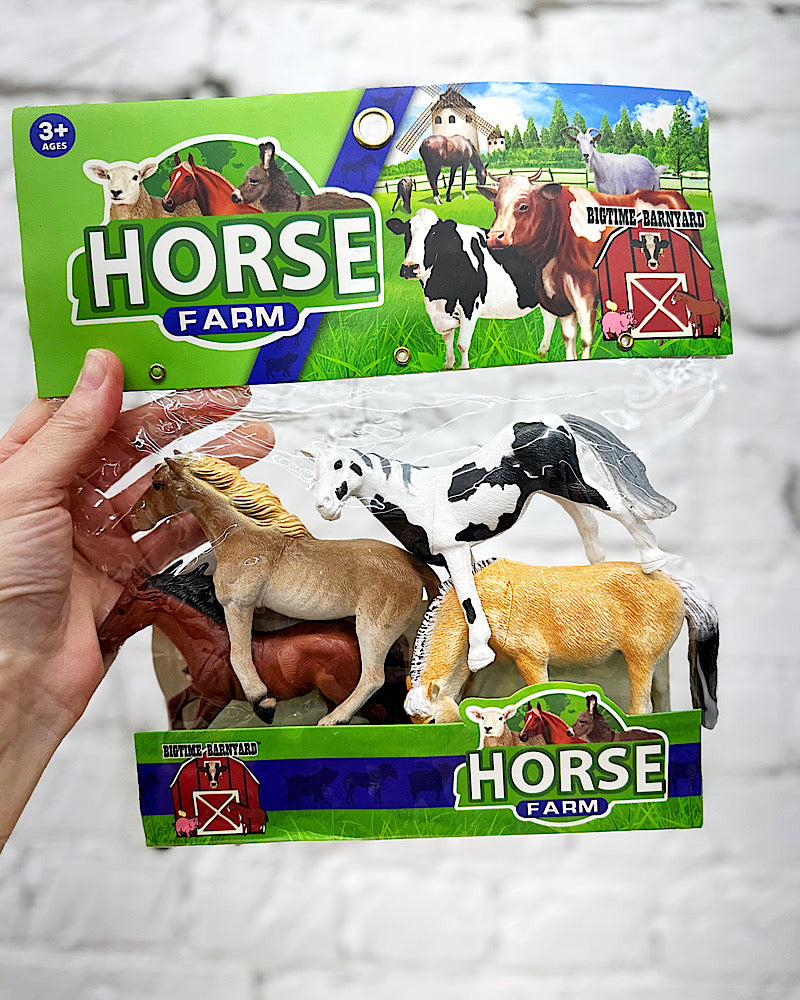 This Bigtime Barnyard set is just what your little one needs to work his own farm. 4 piece horse set containing 4 different colored horse figures packaged in a polybag with hanger card. Recommended for children 3 and older.