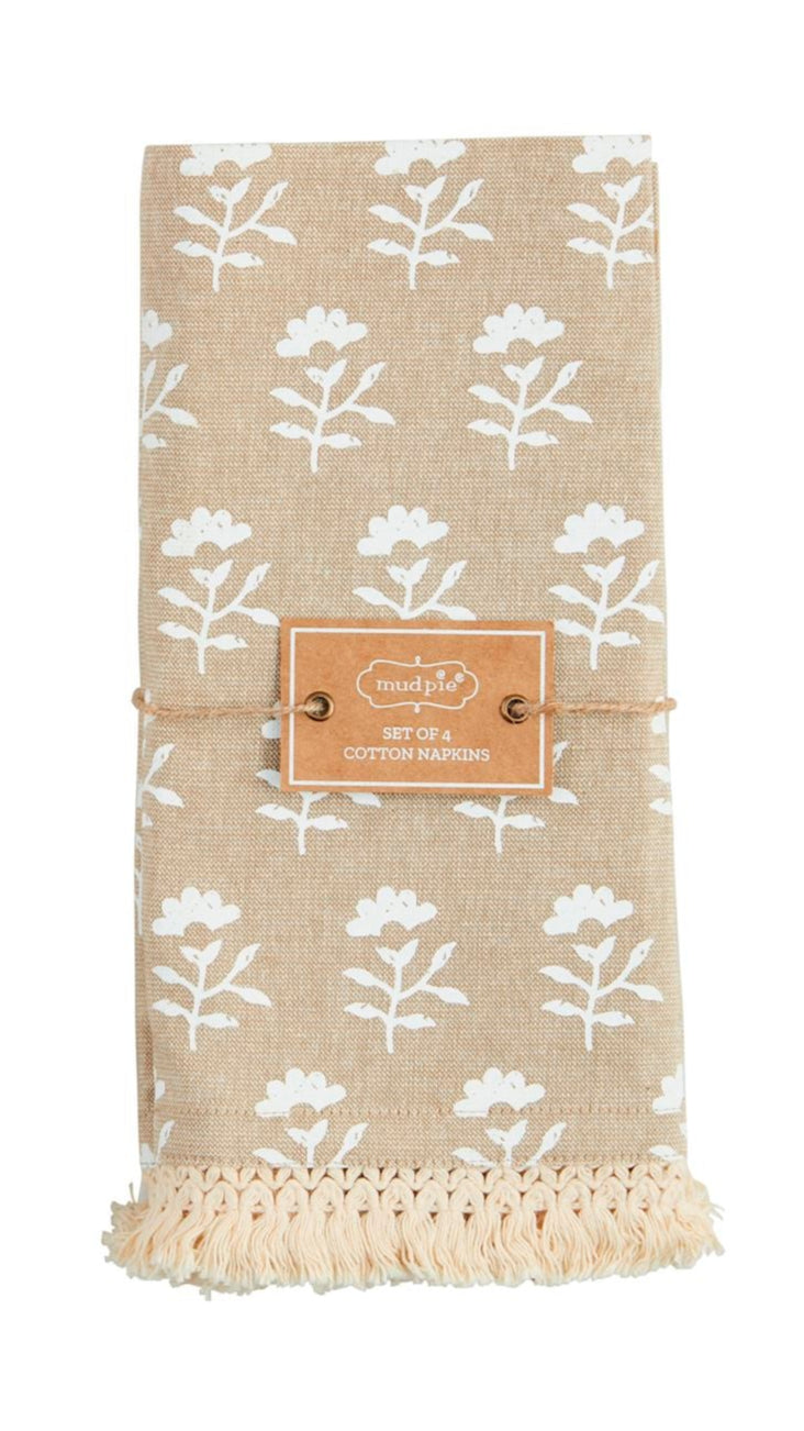Set of four block print cotton napkins with hemstitching or fringe detail.