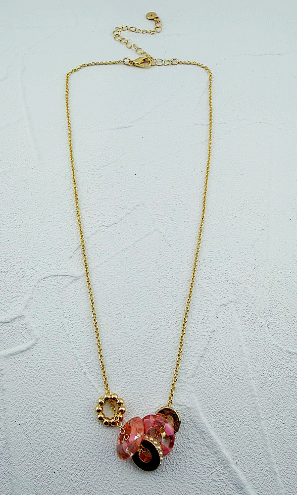 A delicate chain necklace accented with layered rondelle charms featuring real pressed flowers, soft pink enamel, and shimmering stone details. Perfect for adding a subtle pop of color and botanical charm to your everyday look. Adjustable from 16-19"