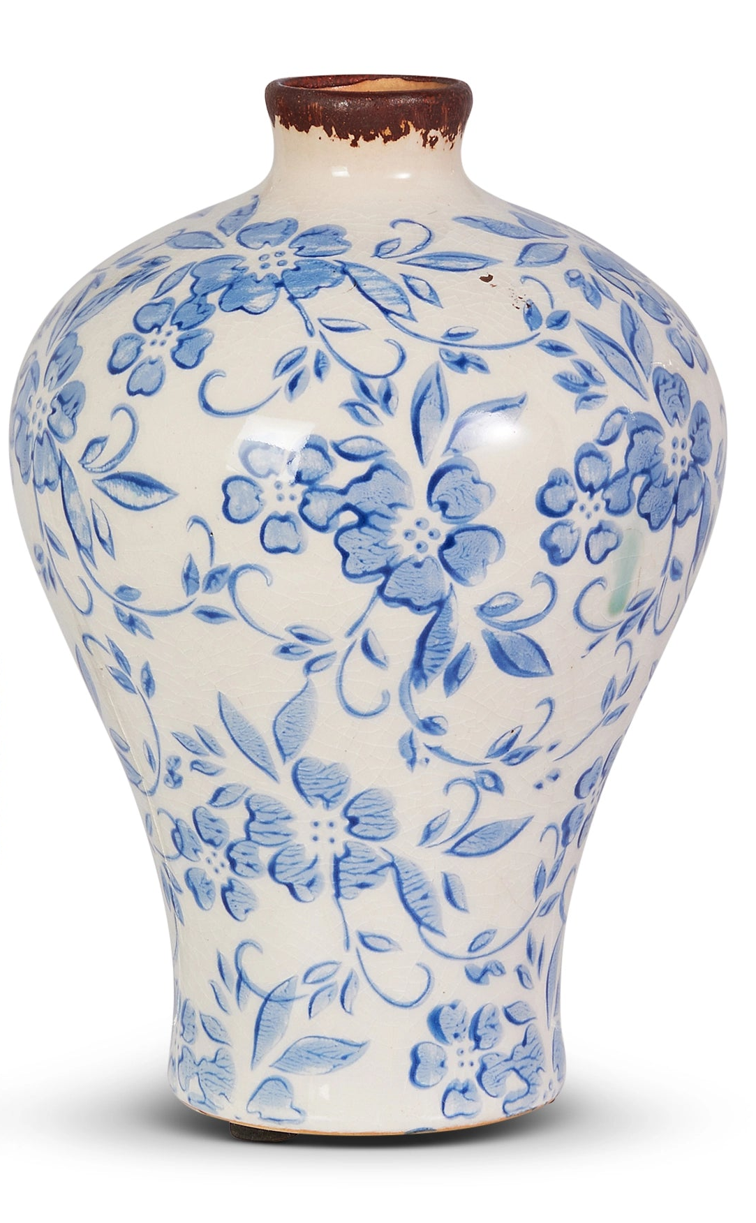 A timeless white vase adorned with intricate blue floral detailing, inspired by classic porcelain artistry. Refined and elegant, this style brings heirloom charm to curated spaces and pairs beautifully with lush arrangements or stands alone as decor.