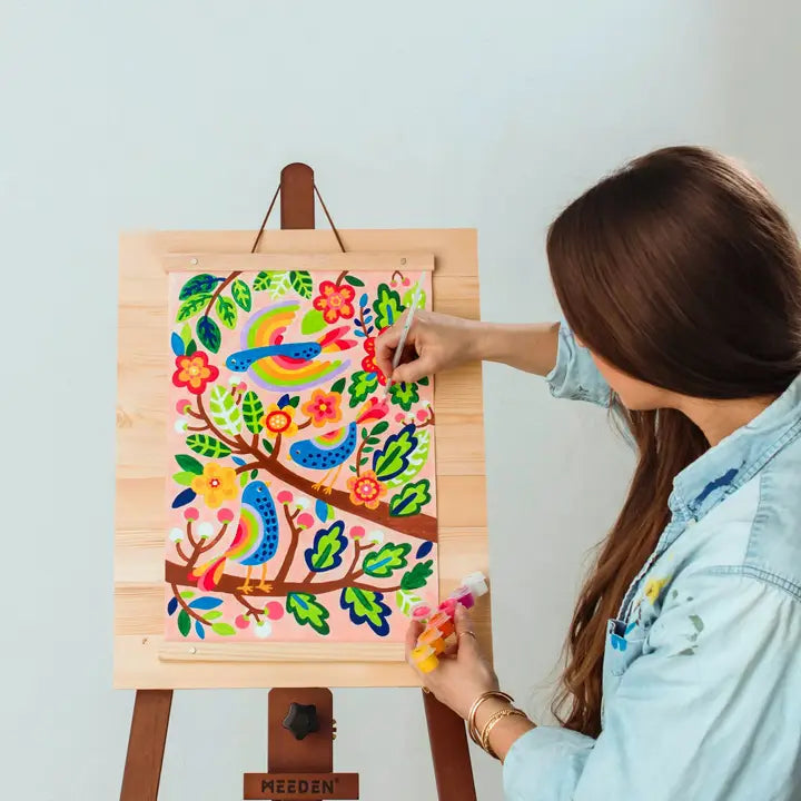 "This acrylic paint set has everything you need from start to finish: 12 paint pots, 3 brushes, an instruction sheet, and even the frame, screws, and cord to hang your finished artwork. The design is a cheery picture of three birds enjoying an afternoon on colorful branches.