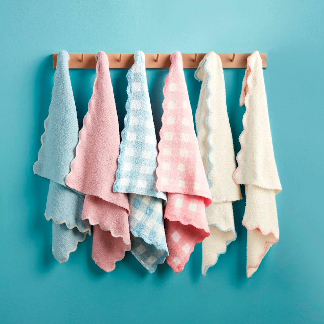 Knit chenille blanket with contrast scallop trim.