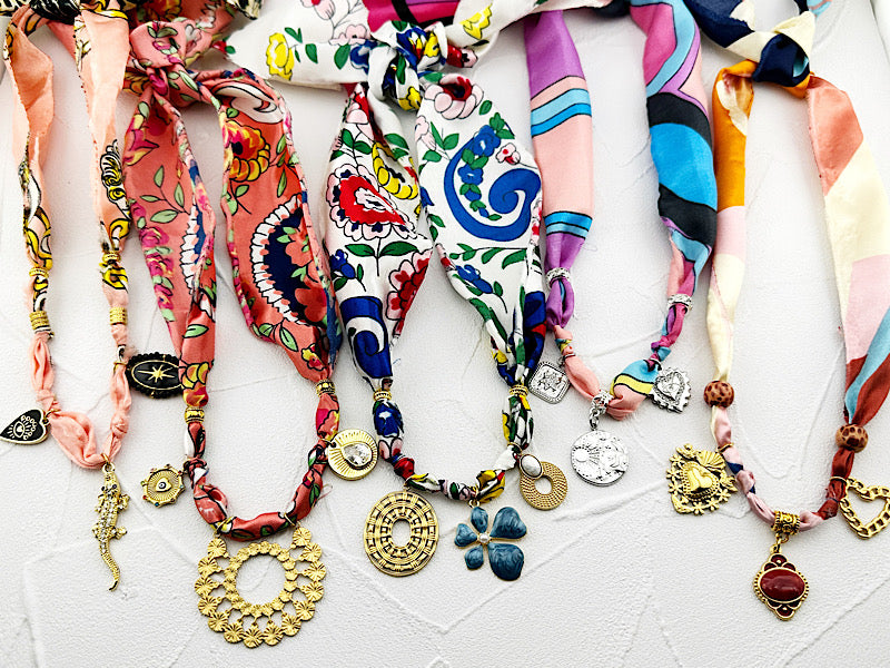 These bandana necklaces are the hottest trend!! They are designed to be tied to the desired length and do not include clasps. For bracelets, simply double wrap them around the wrist and use the same method.
