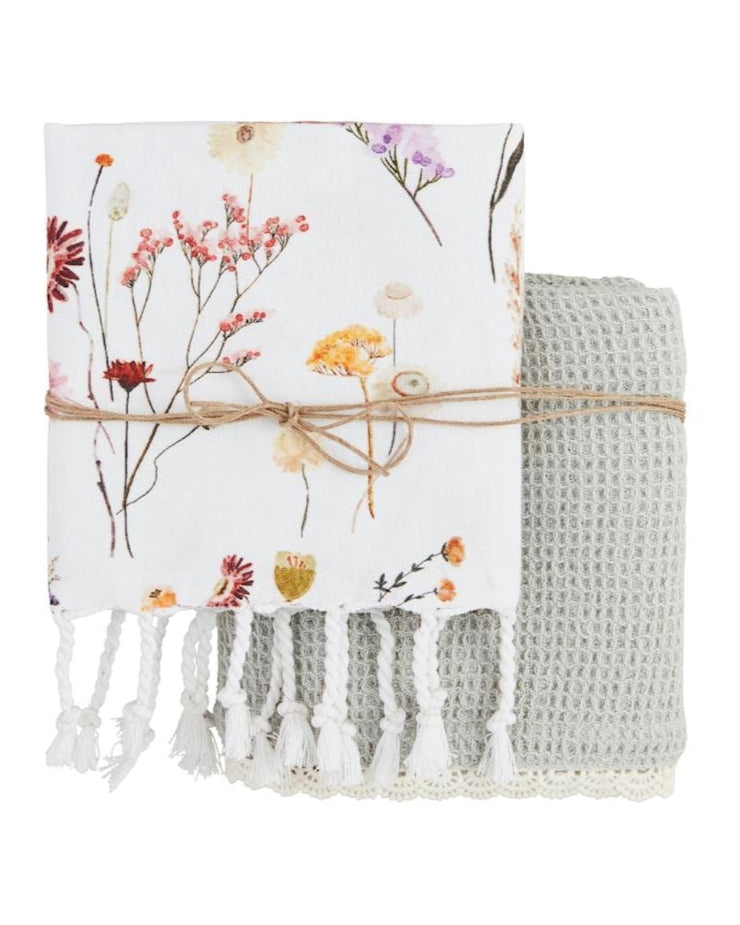 2-piece set. Floral cotton dish towel with tassel trim comes with solid waffle weave dish towel with lace trim. Choose from blush or gray.