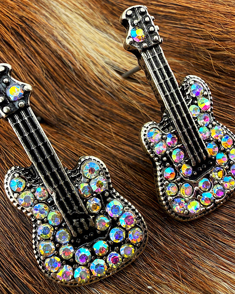 Dainty little guitars. Worn silver finish & dotted with iridescent rhinestones. Post style, 1-1/8"