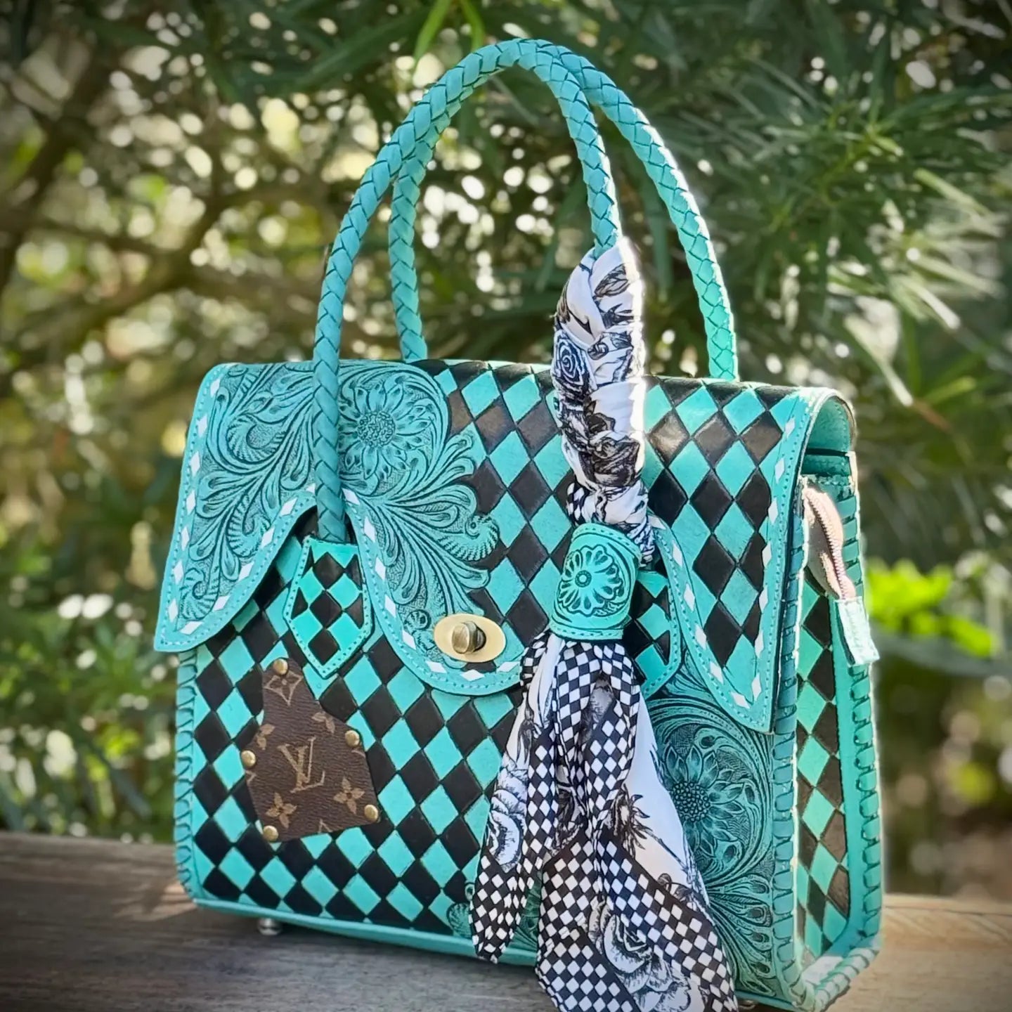 Boujee turquoise & black checkered tooled leather bag. 13” x 10” x 4” zipper and kiss lock closure, adjustable and detachable shoulder strap, neck scarf & tooled scarf cinch.