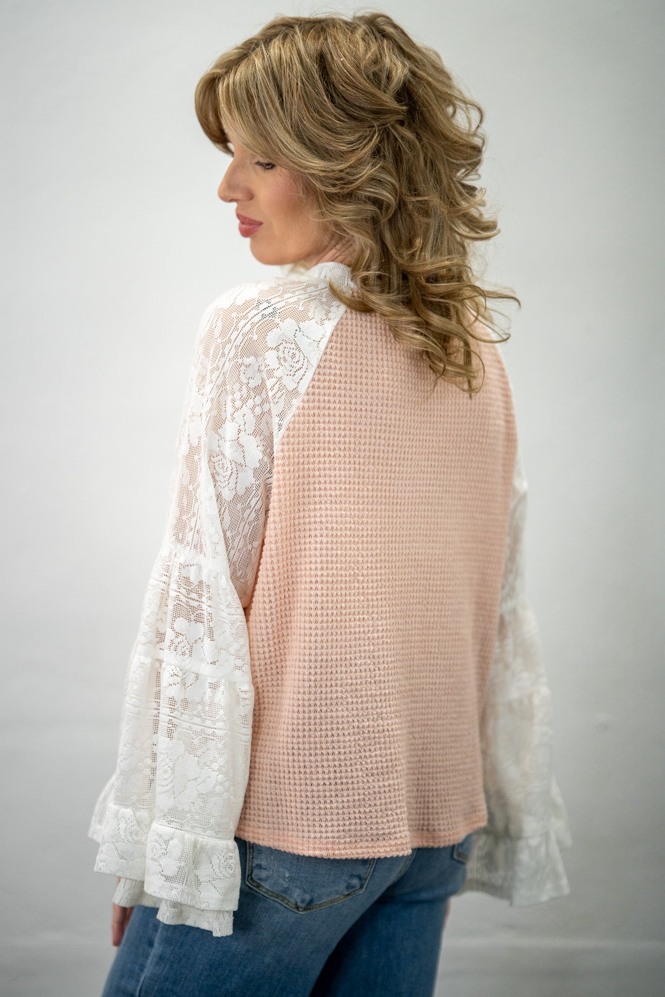 Beautiful, soft waffle style fabric with stunning lace sleeves that have a dramatic bell effect!