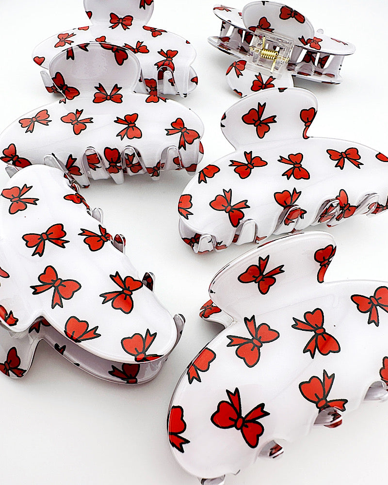 The cutest acrylic hair clip! Lightweight & strong enough to hold a head full of hair. Accented with red coquette bows. 3-1/8"