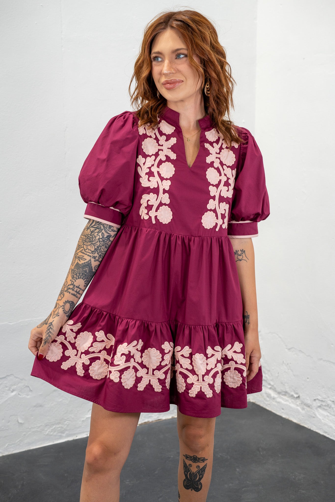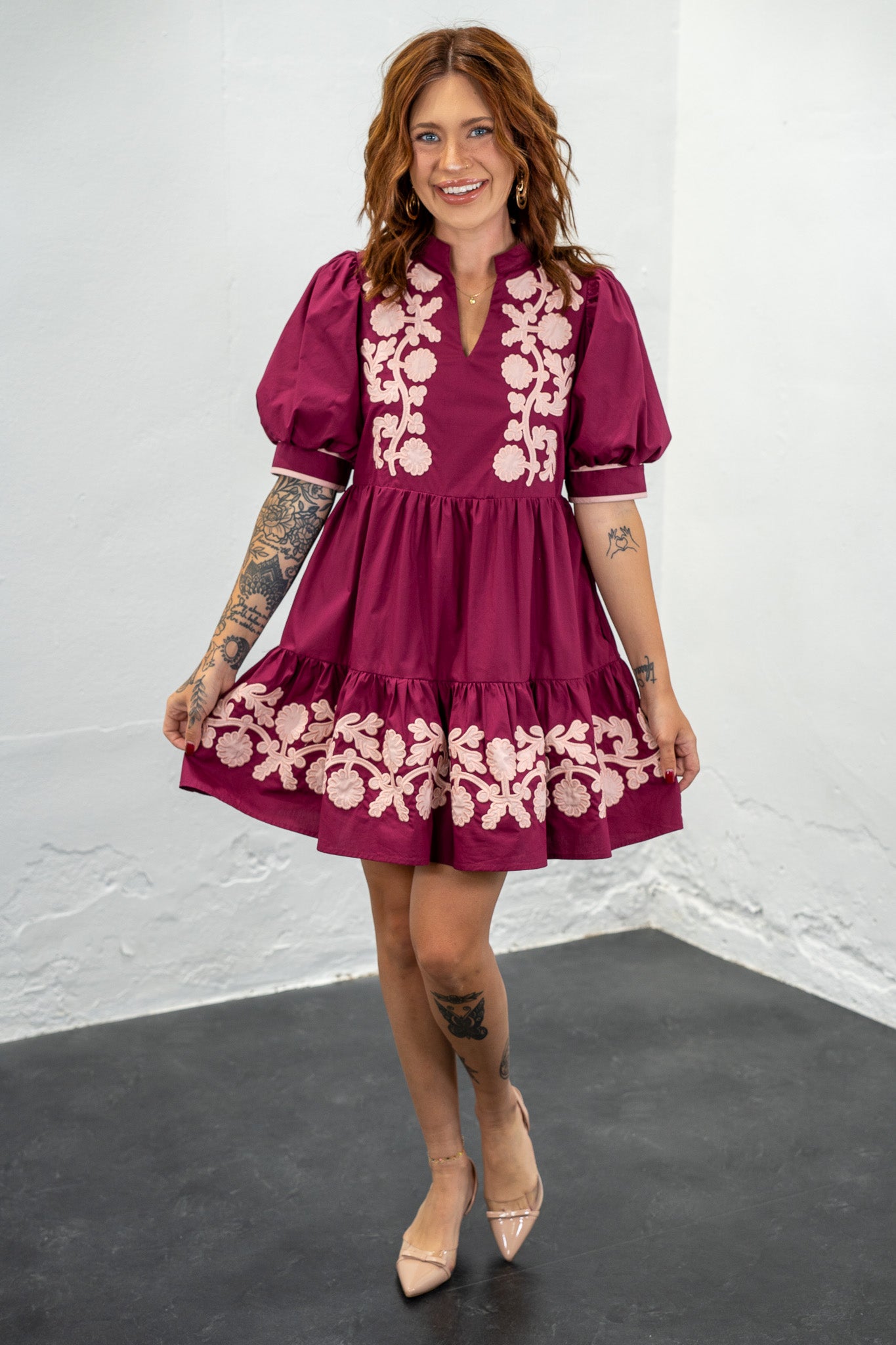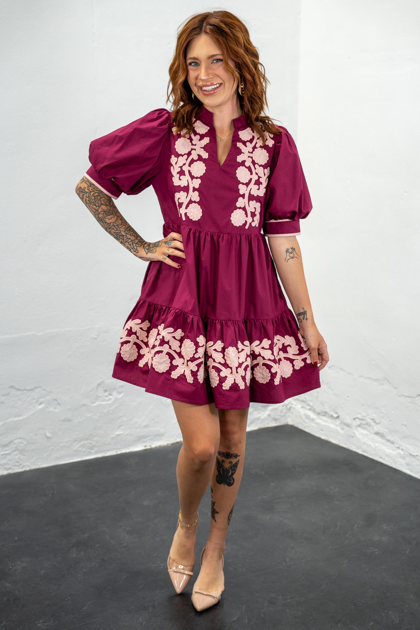 Tiered skirt line, puff sleeves, v-notch neckline and the most gorgeous floral details!