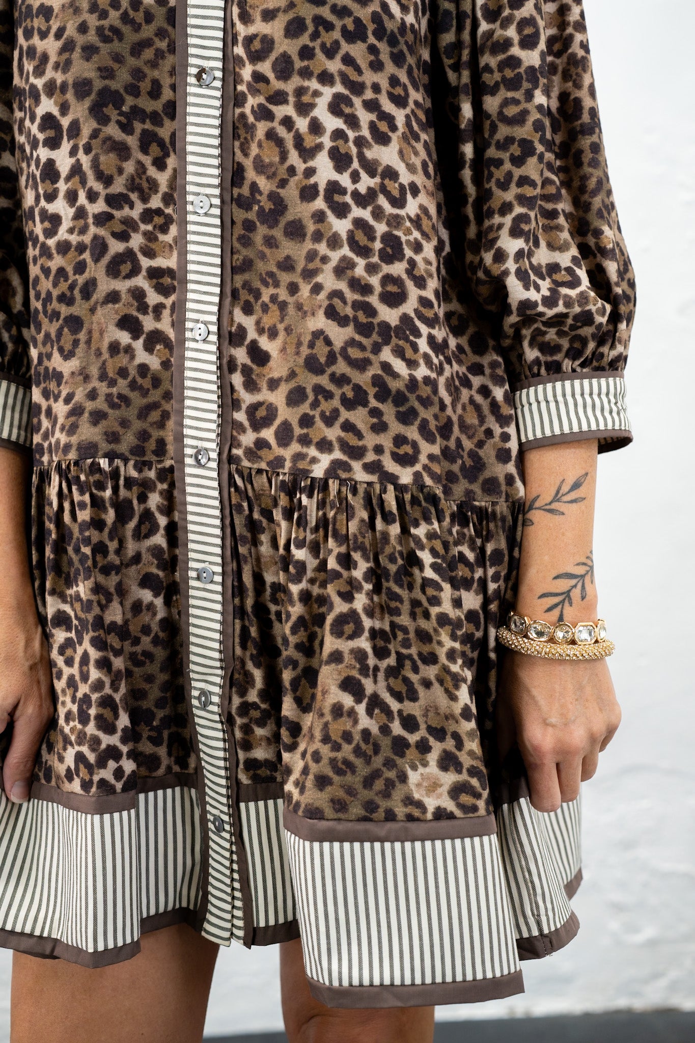 Two of our favorite things.. cheetah print and stripes!! Three-quarter sleeves, pockets and buttons!