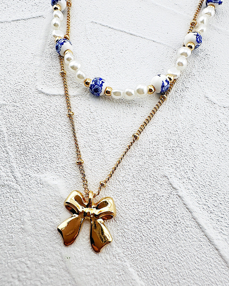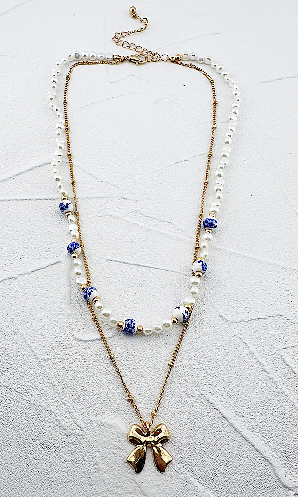 A sweet double layer necklace. A golden ball chain with bow pendant & pearl station necklace accented with blue floral ceramic beads. Shortest layer is adjustable from 16-19"
