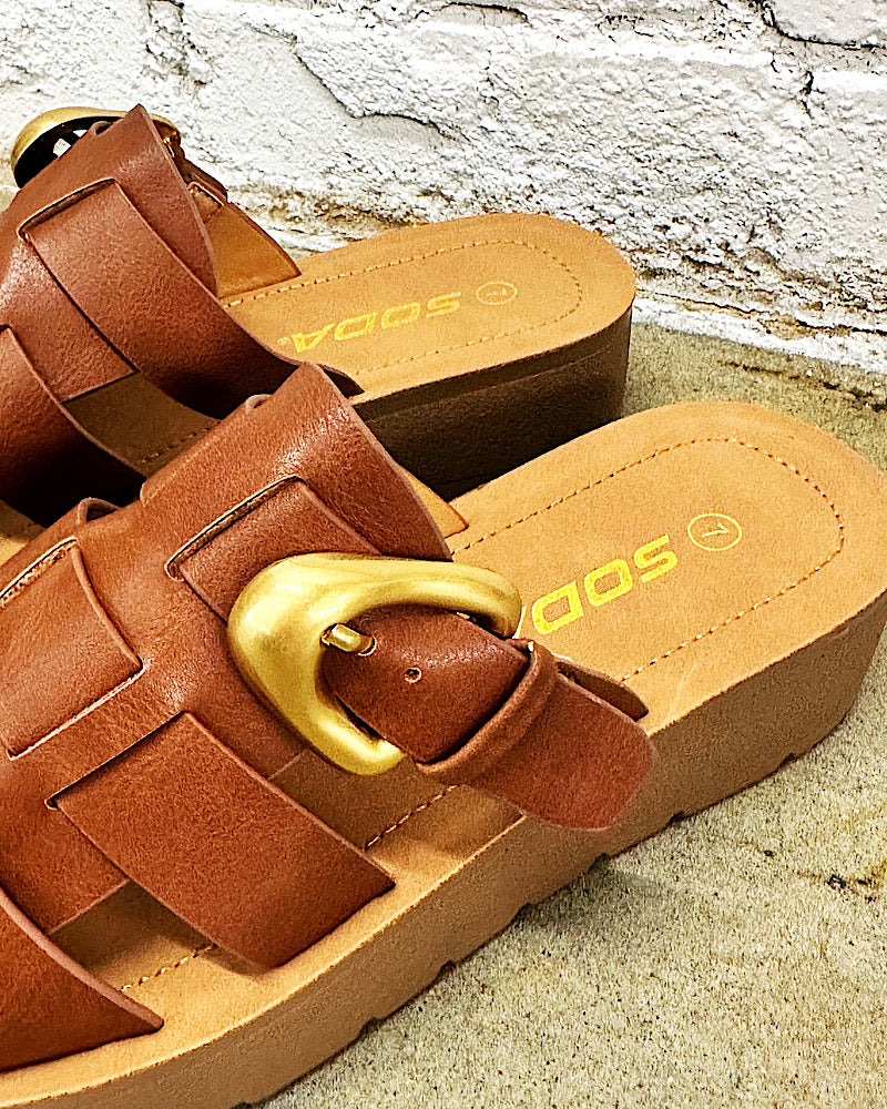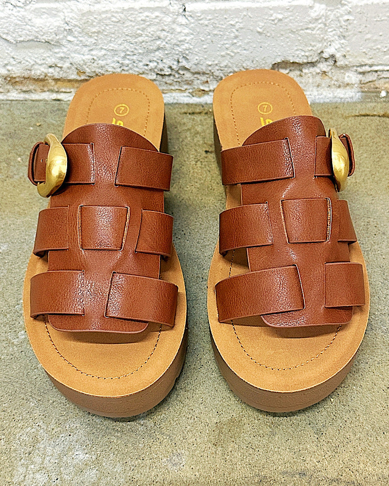 Effortlessly and earthy, the CAMBRIA SLIDE is your go-to for elevated everyday style. Featuring wide woven straps, a chunky gold buckle, and a cushioned wedge sole, this sandal blends comfort with sophistication. The rich cognac tone pairs perfectly with everything from linen trousers to flowy sundresses. Slip on CAMBRIA and step into casual-chic confidence.