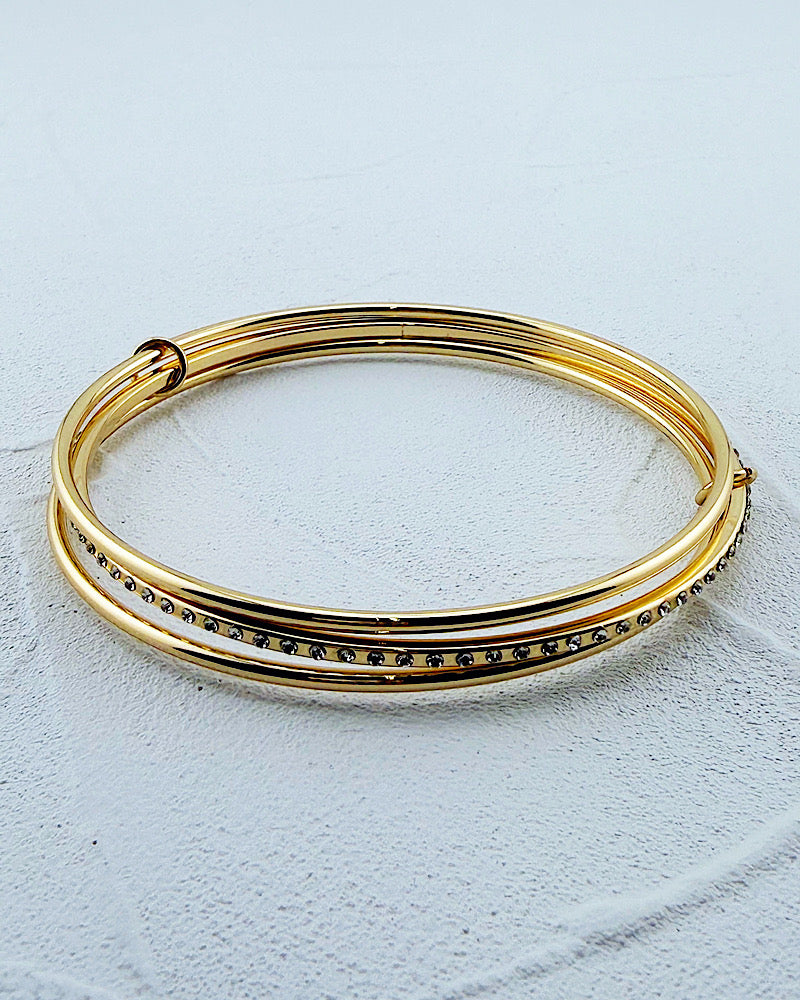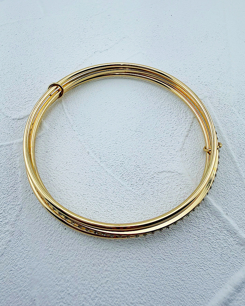 Two-tone hinged bangle trio featuring polished gold bands with a sparkling pavé cubic zirconia crystal row for chic, mixed-metal glamour. One size fits most.