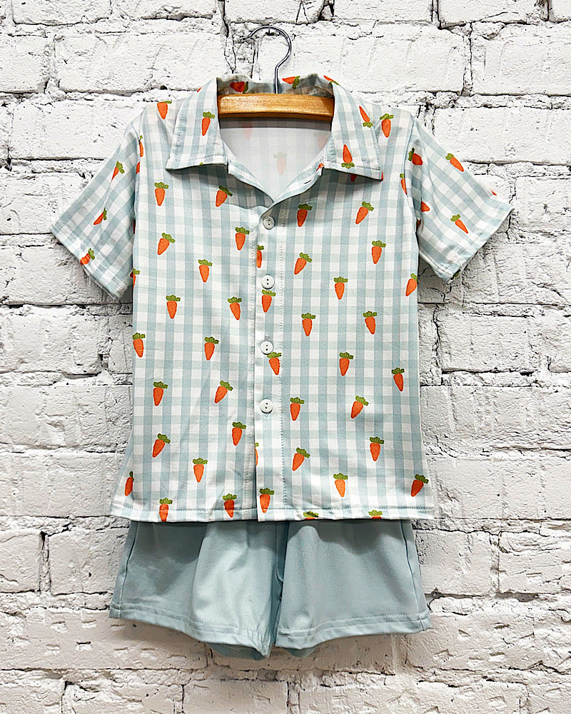 An adorable set for those sweet little dudes! Soft pull on, elastic waist shorts with a cool button-down style top!