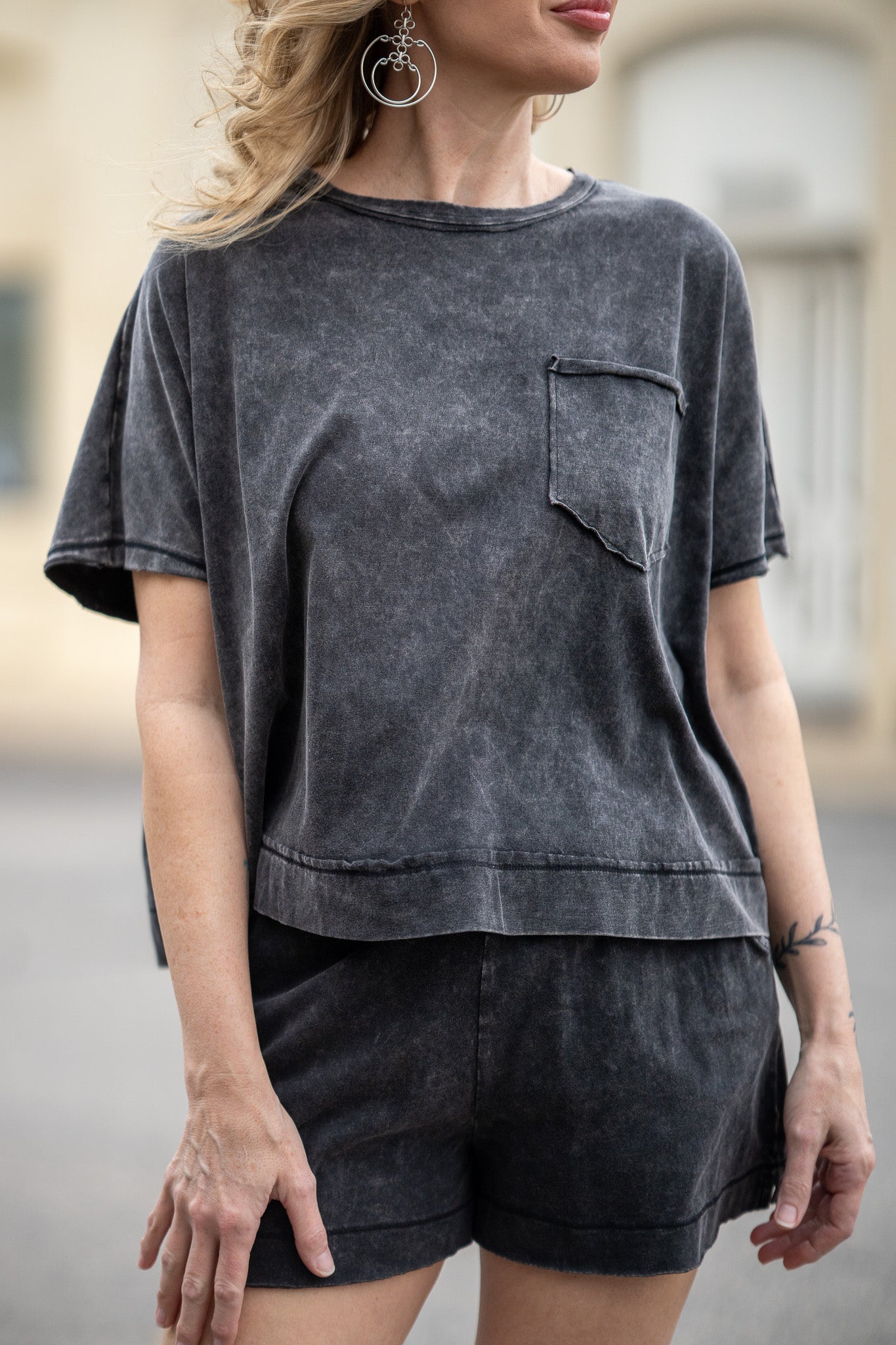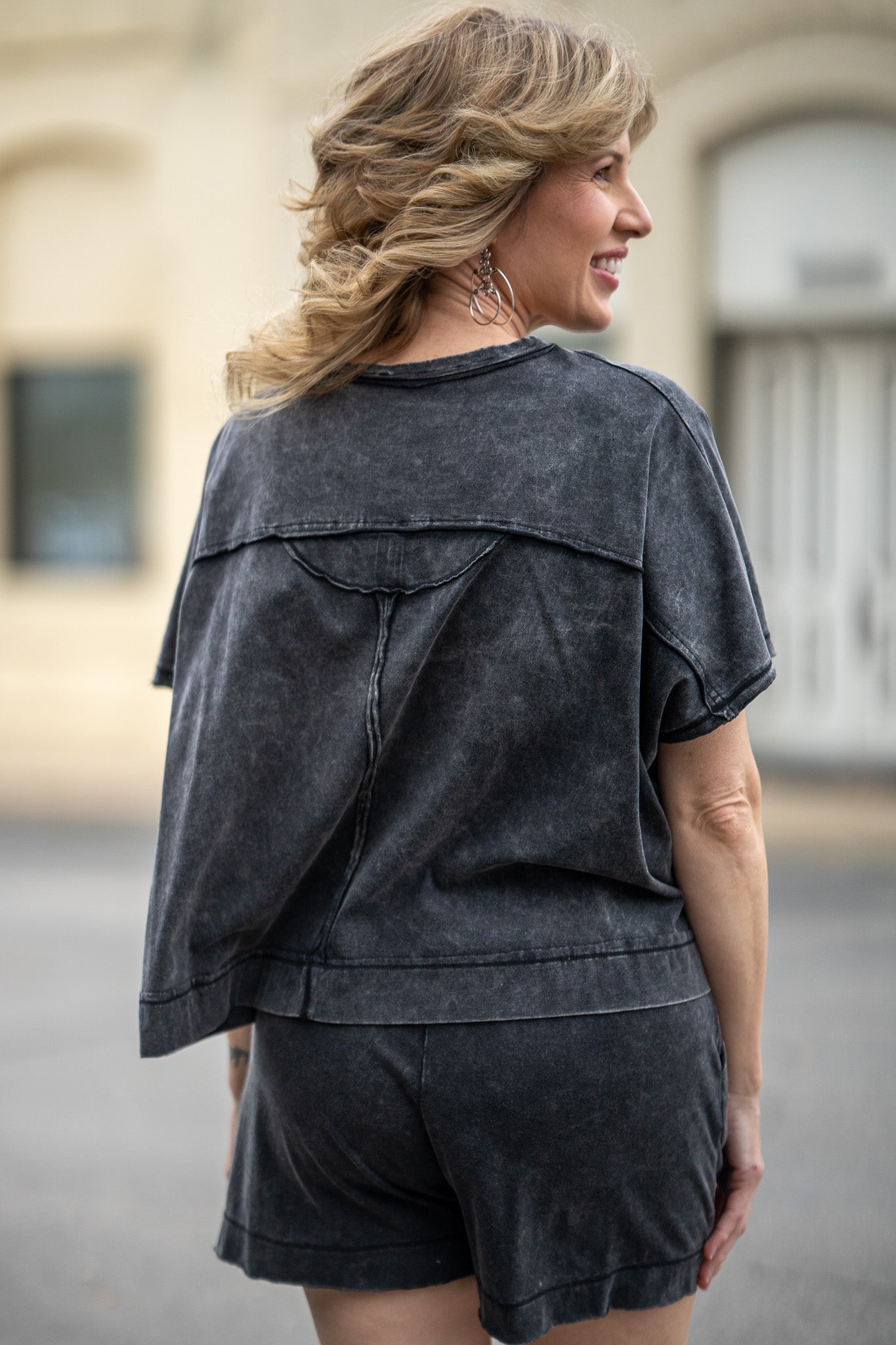 Stay cute, stay casual! Soft, comfy and perfect for year-round wear! Oversized acid washed tee with matching pull-on style shorts.