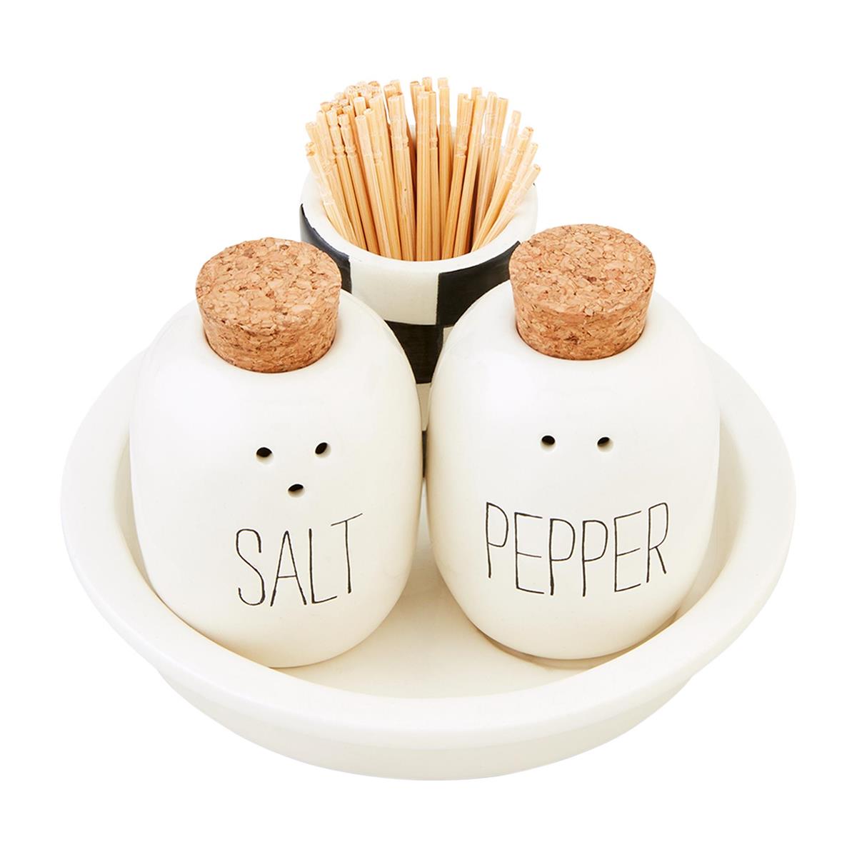 5-piece set. Ceramic plate holds set of ceramic salt and pepper shakers with cork stoppers and hand-painted toothpick caddy with pack of toothpicks.
