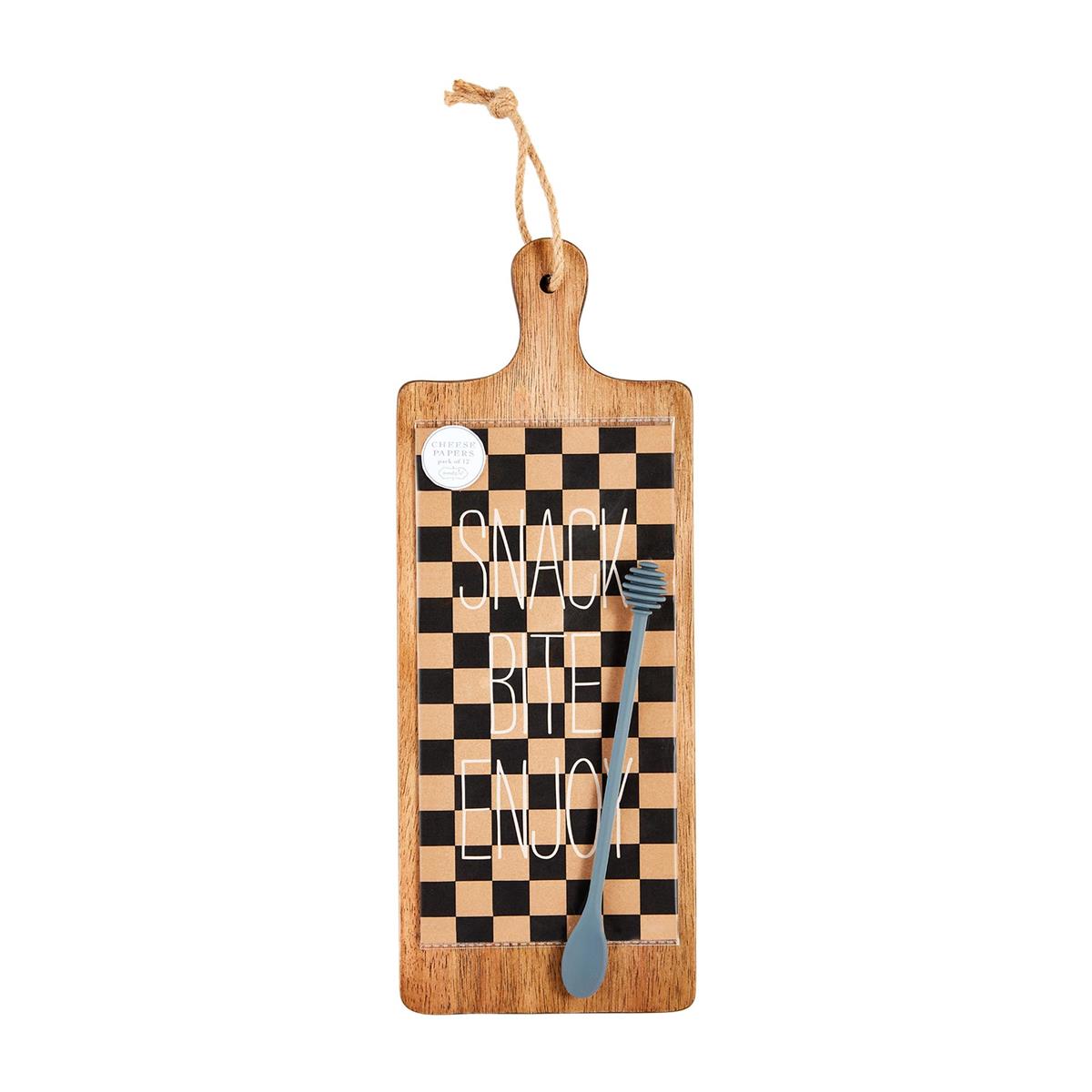 3-piece set. Wooden paddle board. Comes with pack of 12 kraft cheese papers and silicone and wood utensil.