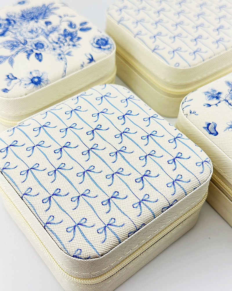The ultimate solution for keeping your jewelry safe, organized, and tangle-free while on the go. It features three necklace hooks, ring slots, and adjustable slots for added organization. Secure zip closure. Measures 4"x4"x2". Available in floral or bow pattern.