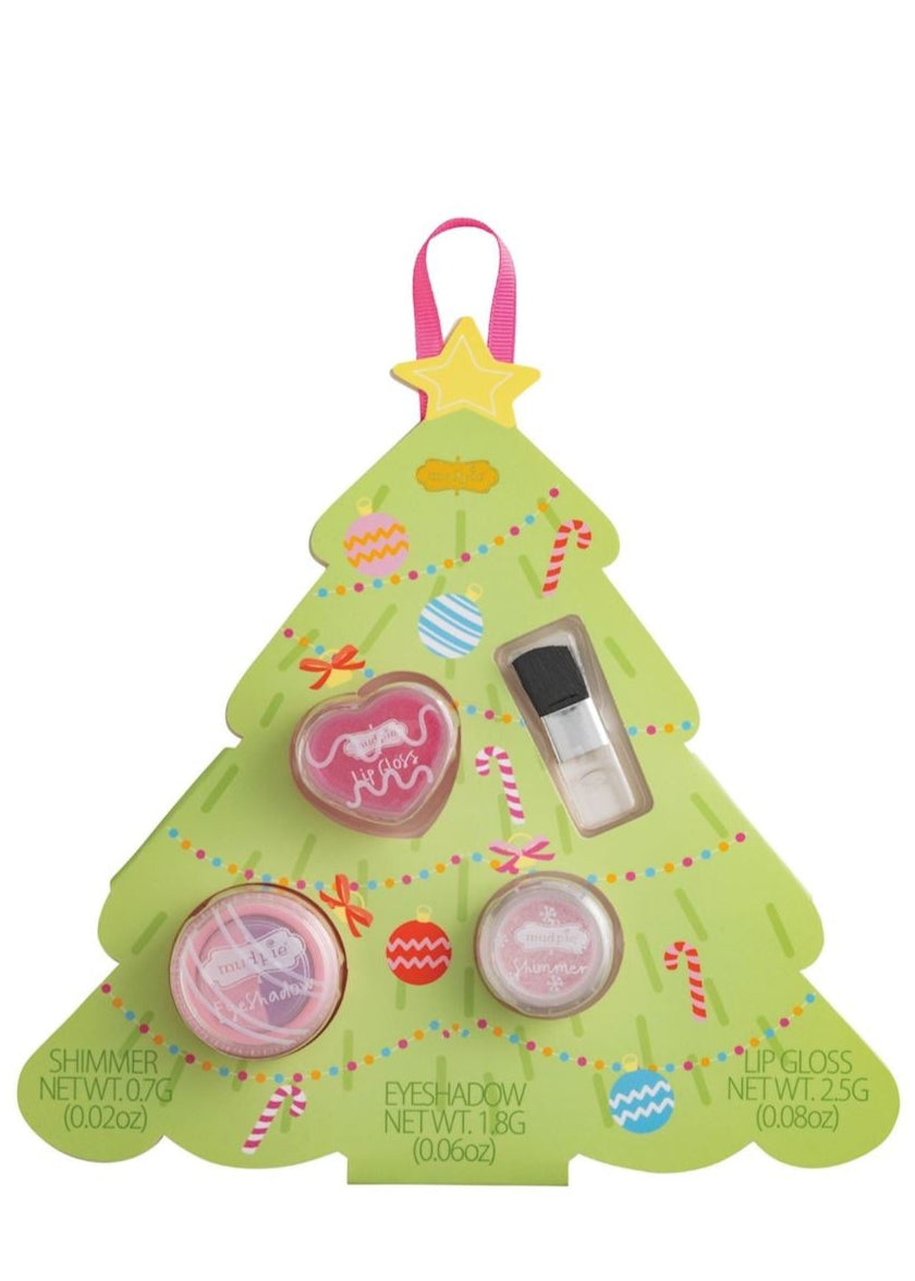 4-piece set. Play eyeshadow, lip gloss, shimmer glitter and make-up brush come on figural display packaging with ribbon loop hanger. Ages 3+