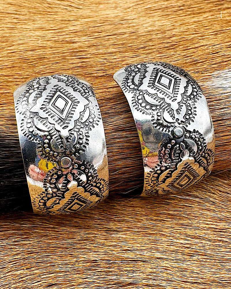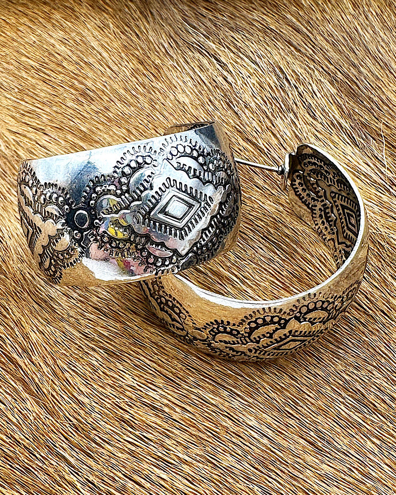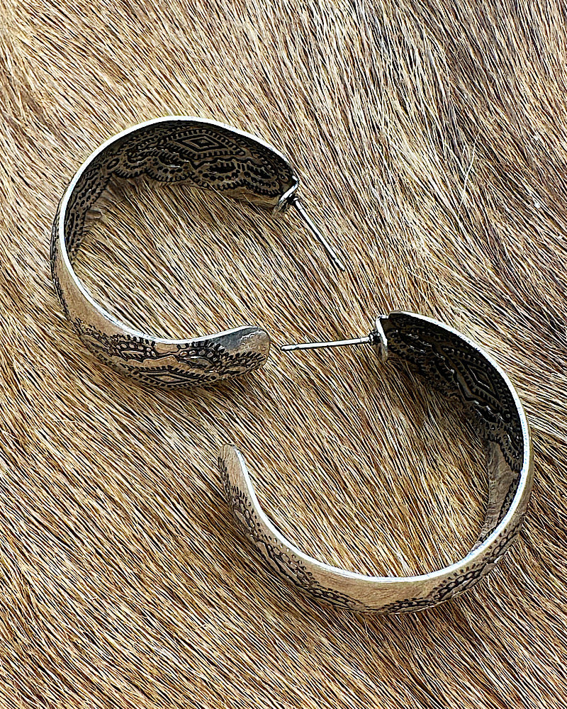 An all-time best seller!! These lightweight stamped metal hoops are classic. With a worn silver finish, post style, 1.25" diameter