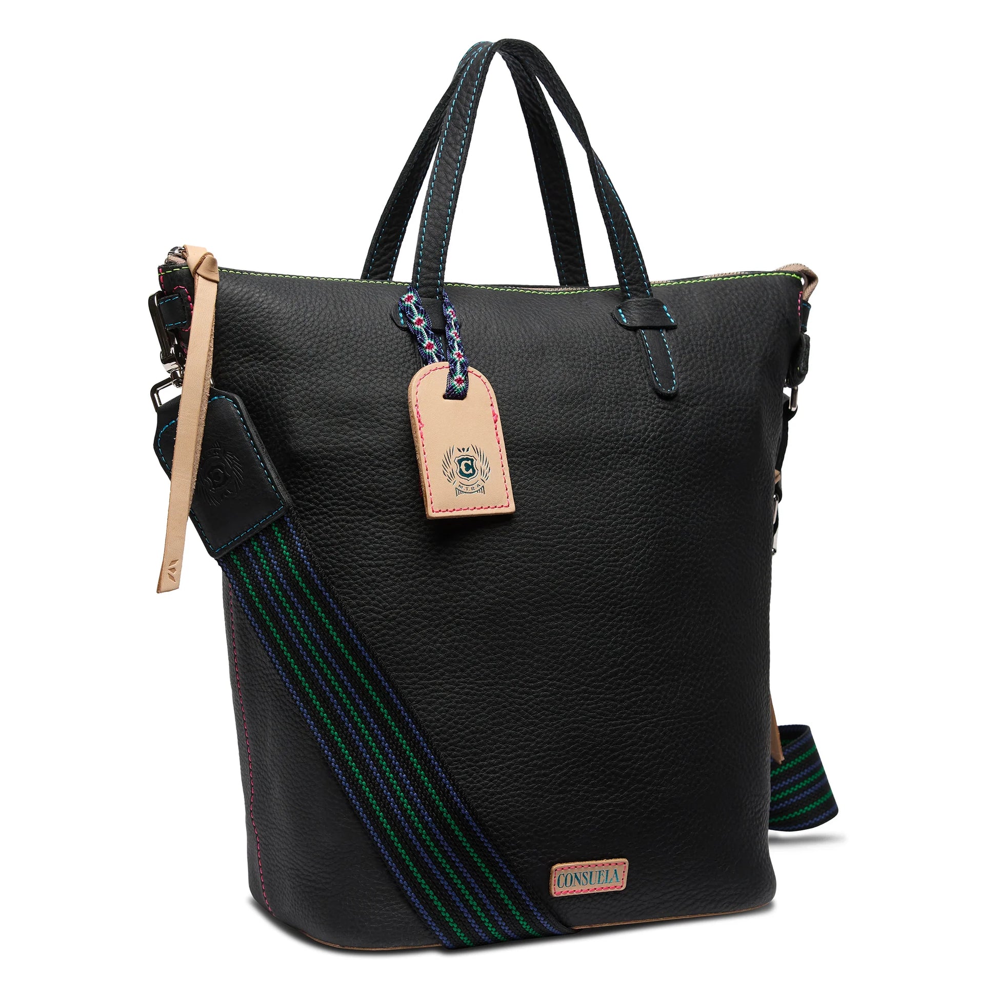 - Cyndi black pebble leather exterior, handles, and trim