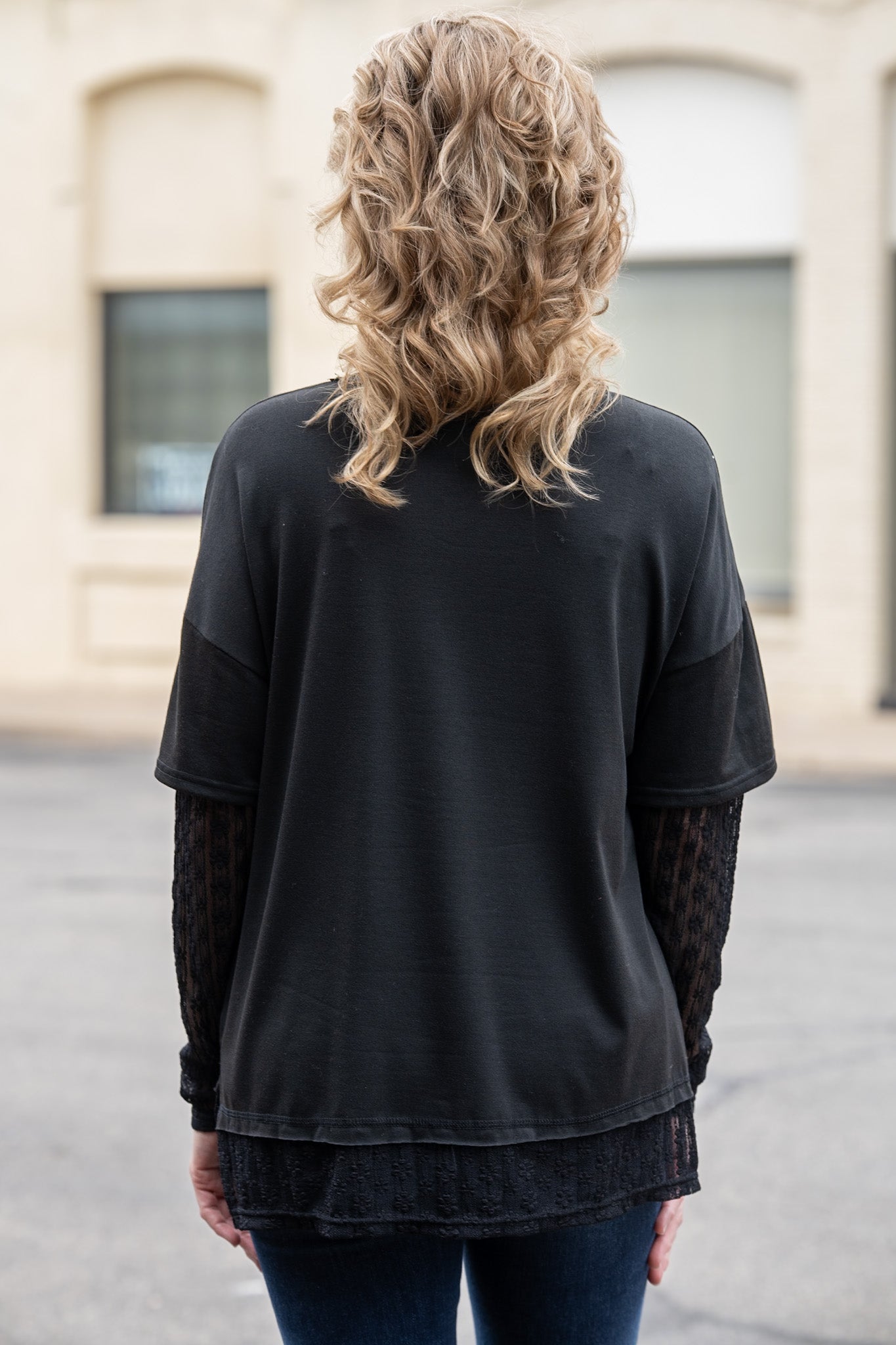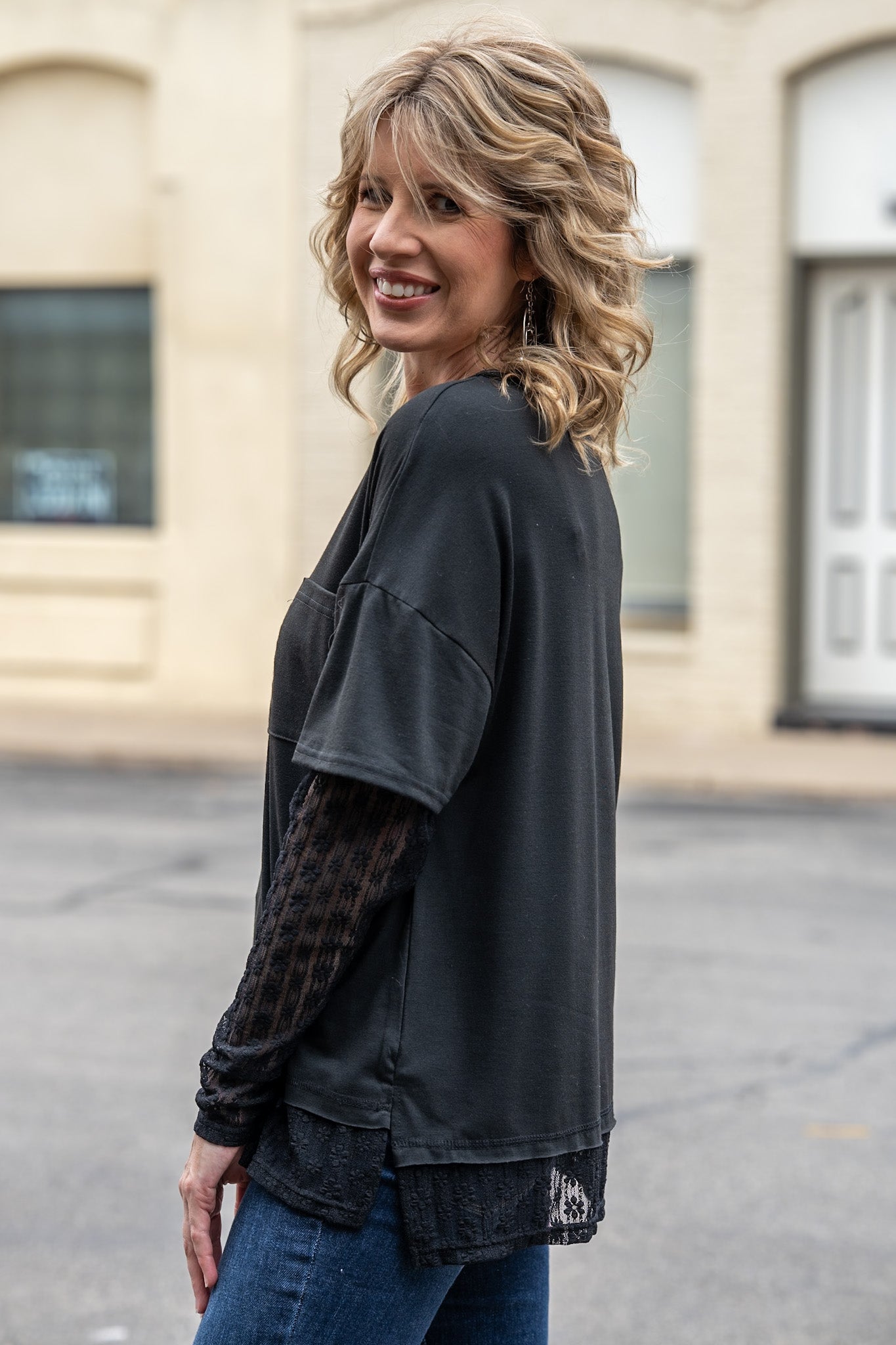 Featuring delicate lace sleeves and hem lining, that add beautiful texture and charm! Soft, flattering and easy to style, this top is comfy with a elevated, elegant touch!
