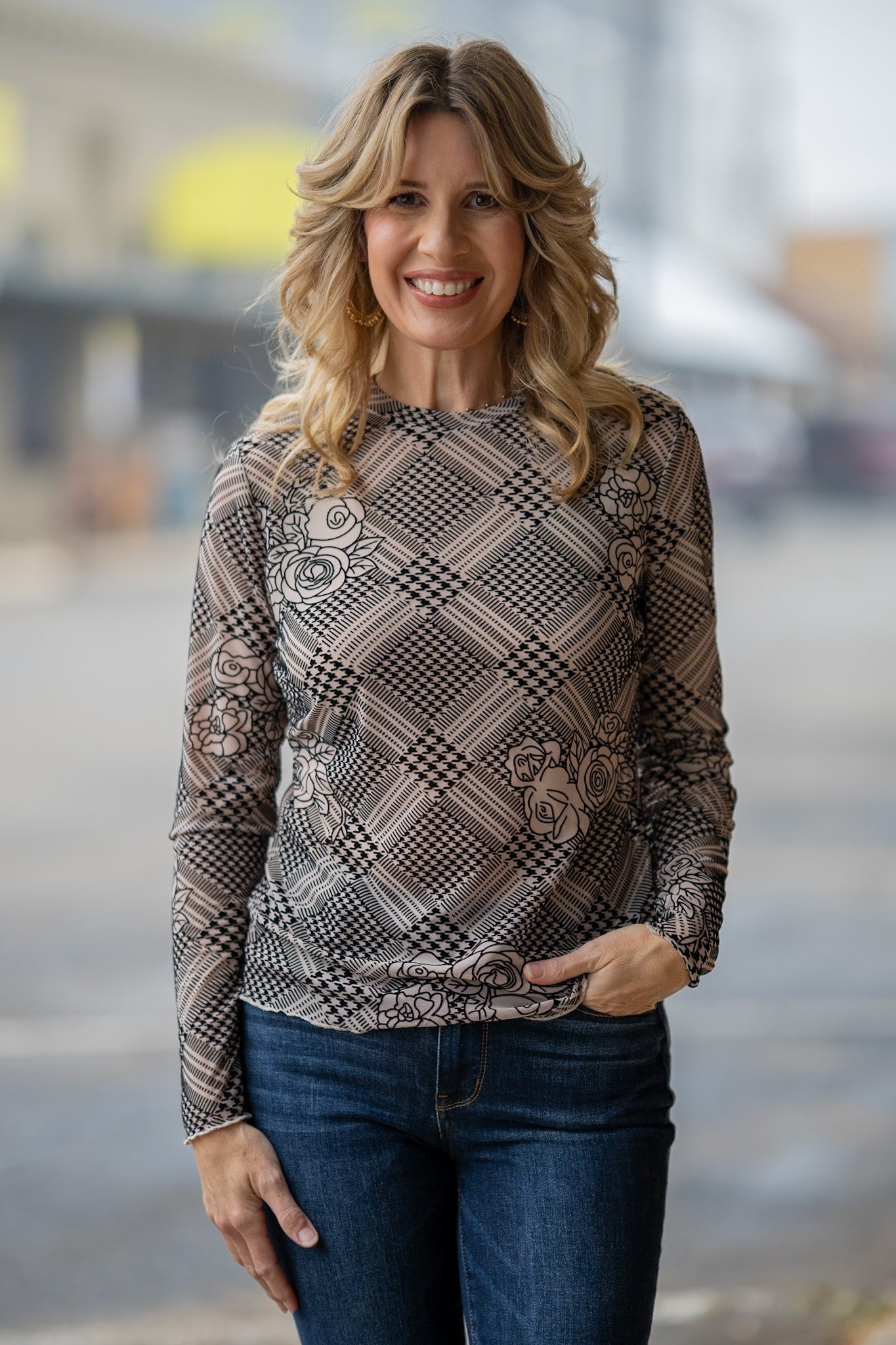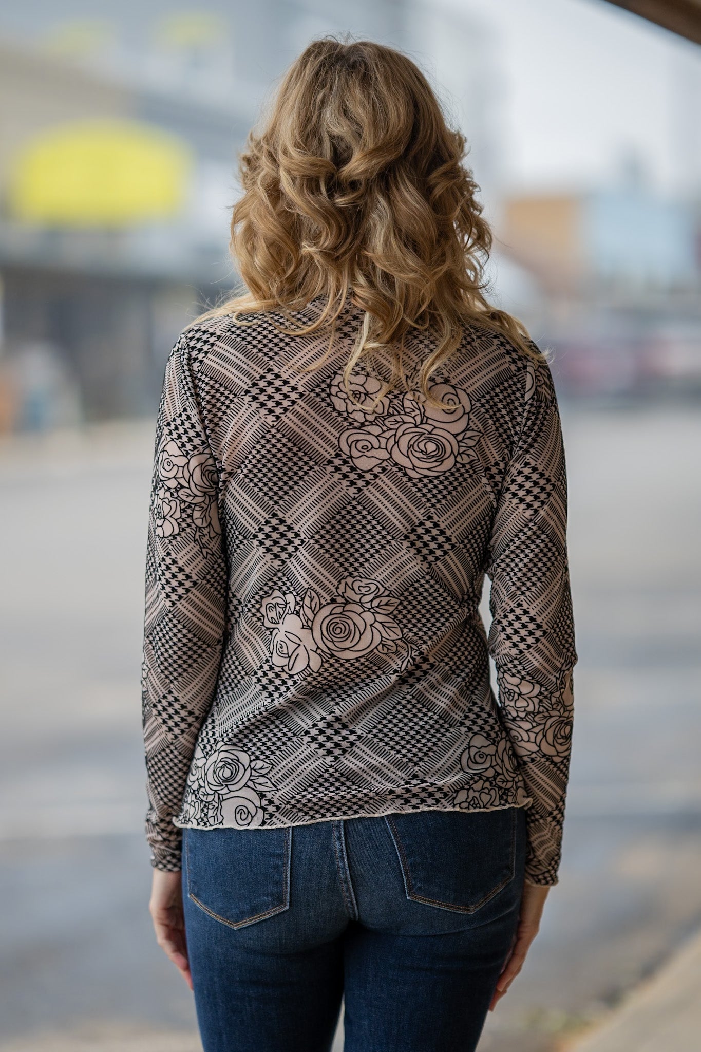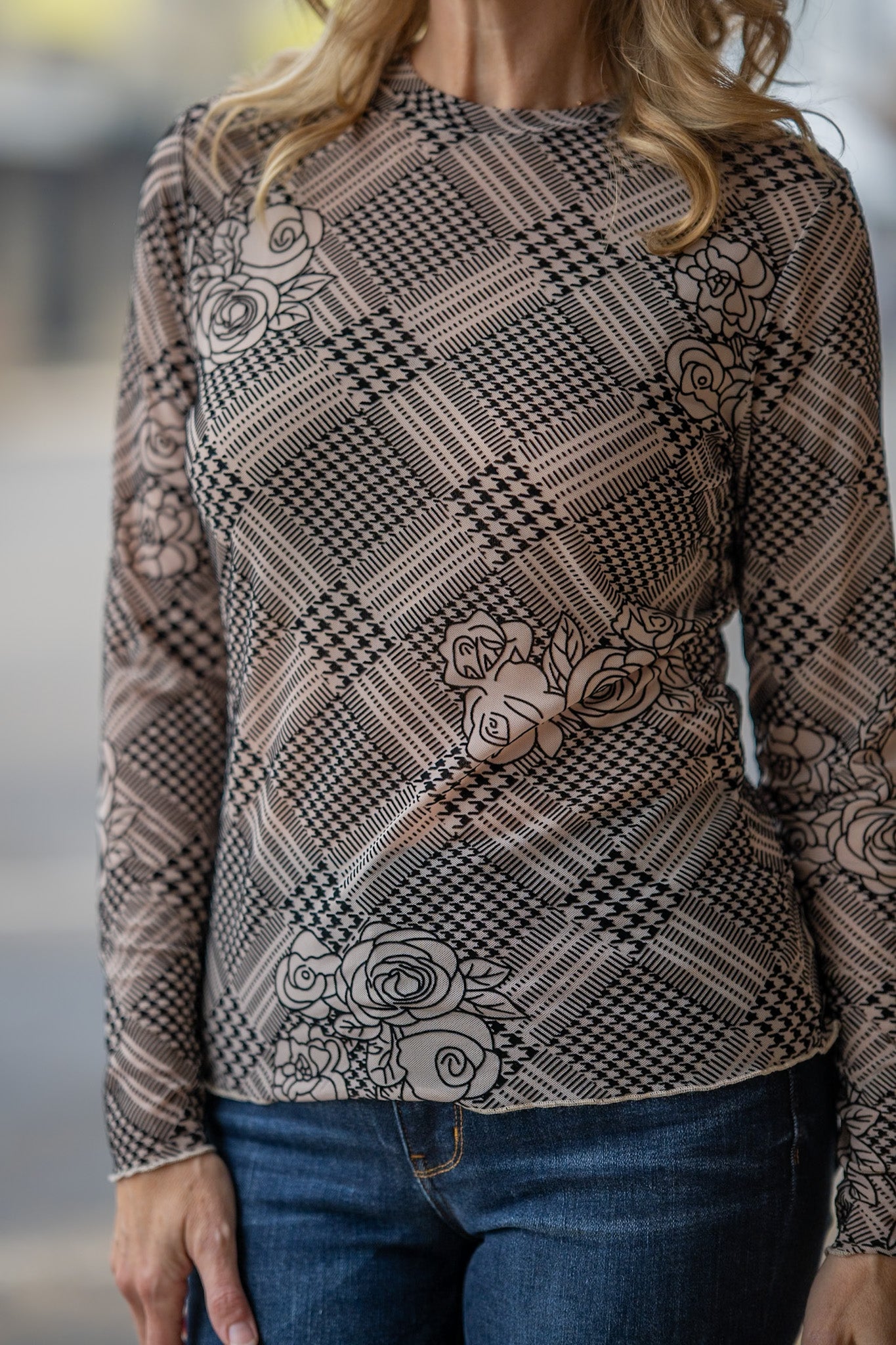 This top has a 3D effect to it with a flocked/velvet feel to the design. Soft, stretchy and oh-so-easy to style!
