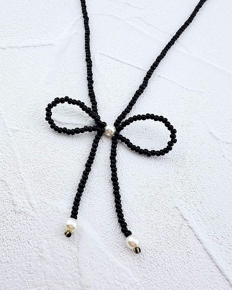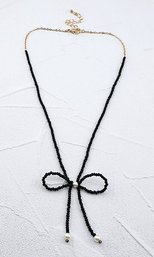 A necklace like no other. Daphne is tied up in a bow with the sweetest details. Dainty black beads, golden chain links & pearl accents. Lobster clasp, adjustable from 16-18"