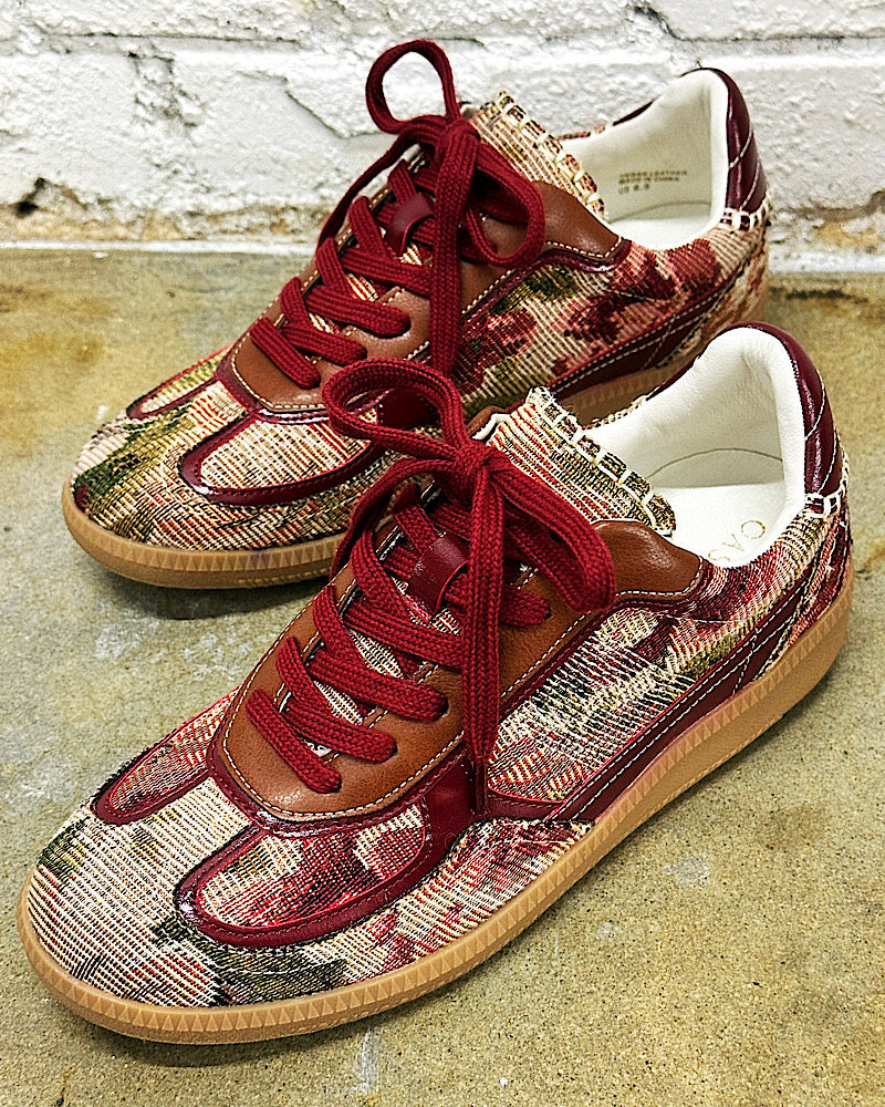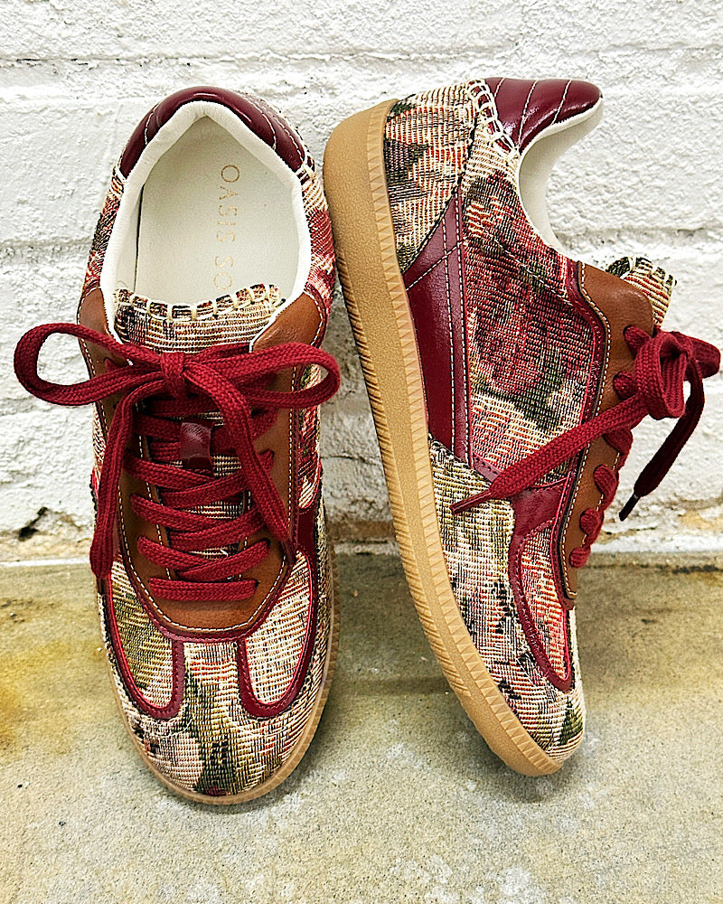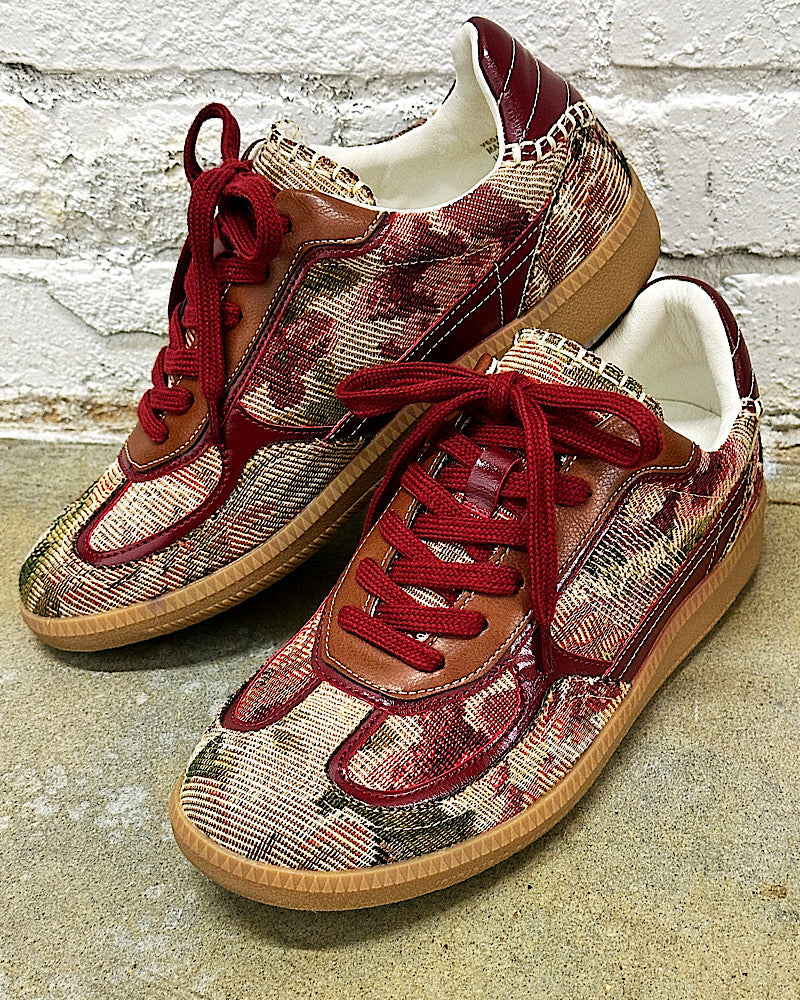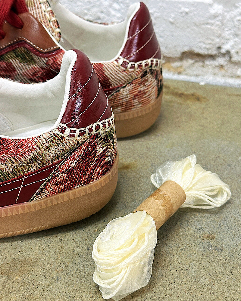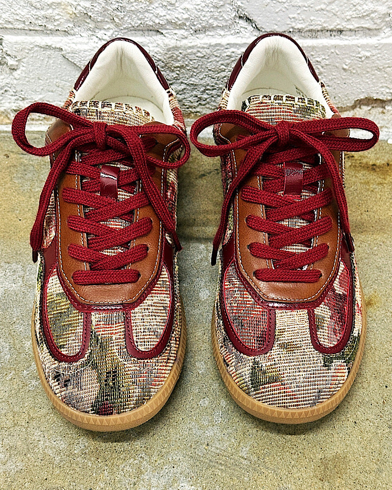 Vintage charm meets modern flair with the DELILAH LUXE sneakers. Wrapped in rich tapestry-style fabric with burgundy accents and dreamy, oversized ribbon laces, these shoes are a statement of soft elegance and bold individuality. From the scalloped edging to the textured sole, every detail whispers sophistication with a twist of whimsy. Perfect for dressing up denim or adding personality to your naturals.